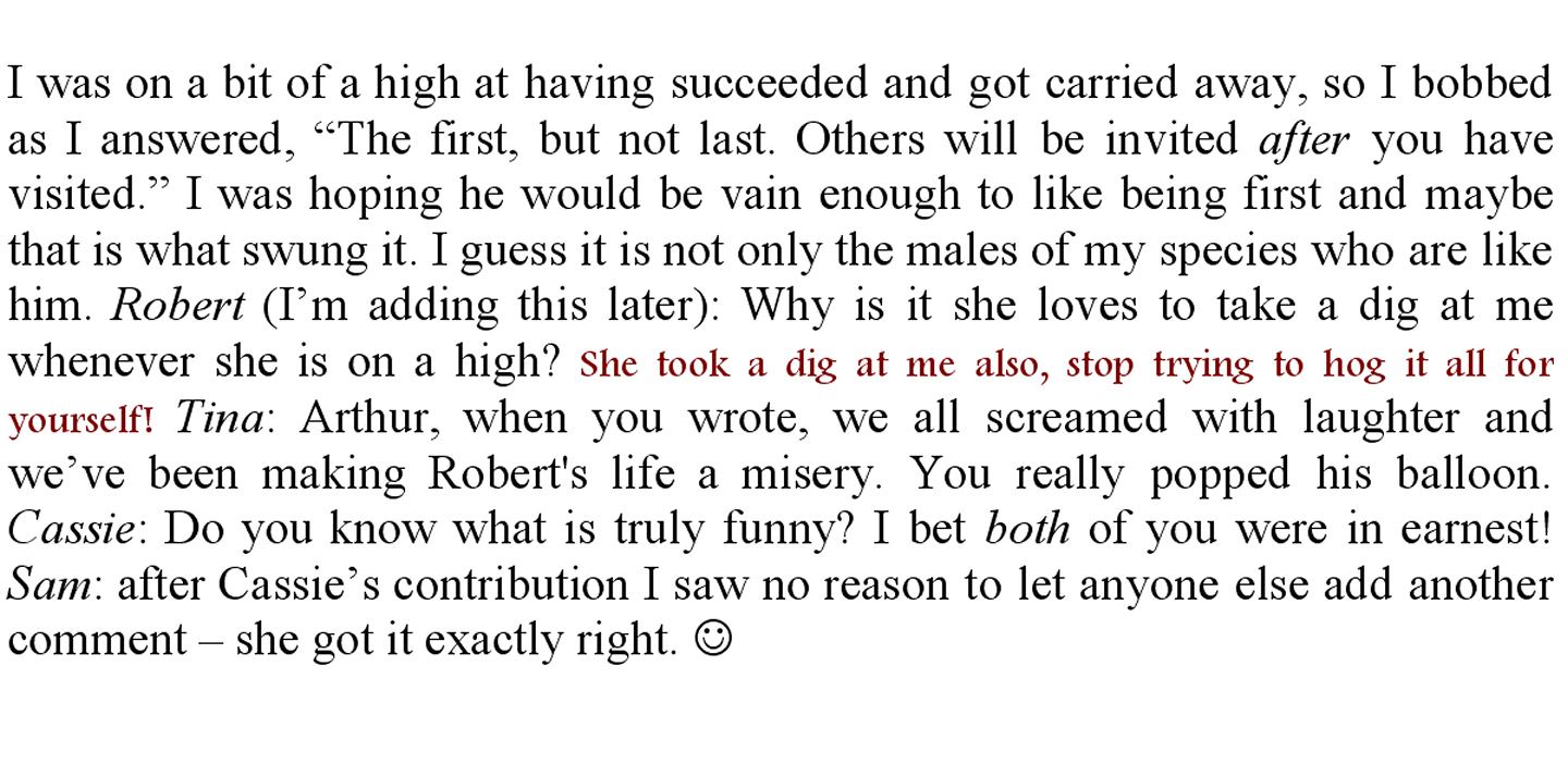 I grinned. “I was wondering whether they don’t want to acknowledge our existence because they think we are all females. What if a male tries to talk to them? Arthur, are you up to it?”