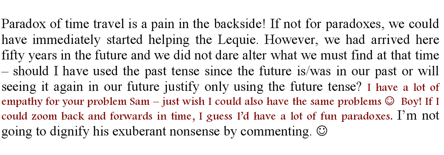 It has taken nearly four years of Freddie time. I did not write since nothing worth writing about happened. We now hold the total Lequie population in their niche and we already have the first embryos being hosted by very happy males. The females are still feeling too crushed for their family lives to be healthy, but with time they’ll become healthier. Now we have to return another couple of hundred years so as to choose those Lequie whose family lines died out, to add their genes back into the pool. We would like to see their population reach the half million mark before we leave. I did not have to ask for what I wanted, the rest of the Cherinians in Freddie felt the same way and Kajy Lygejol is the very first Lequie Cherinian. It should not take long for the rest of them to become Cherinians.