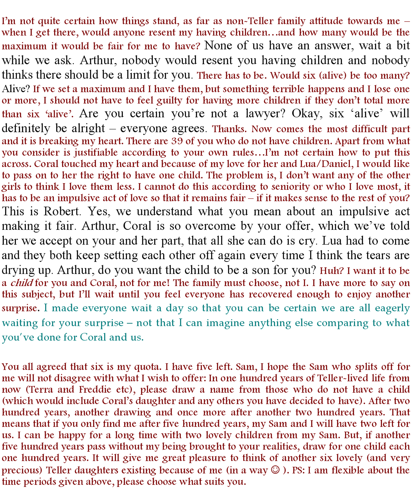 We did spend that night and the next ones…till now, our present, mostly loving Coral and I’m certain she’ll be fed up of us within a few weeks. Until our little girl is born, Coral not only will be adored as she has never been before, she will also find herself surrounded by loved ones all the time - none of us dare take the risk that some disgruntled Talent attacks her. Cherinians watch the various web sites that are not in our favour in case we get a hint of trouble to come and I found it surprising that nobody really attacked me for getting Coral with child as a six year old. It seems people are starting to accept that seeing a Teller child does not mean my loves are children. I’m glad they are starting to feel that way, but I hope I never do.Robbie handed over to me as he says we are not likely to have much to write about. He is hoping our days will be filled with adoring Coral and our daughter. Once her mind starts emoting, then we truly will be a fulltime captive audience, sharing while carefully avoiding our influencing her.