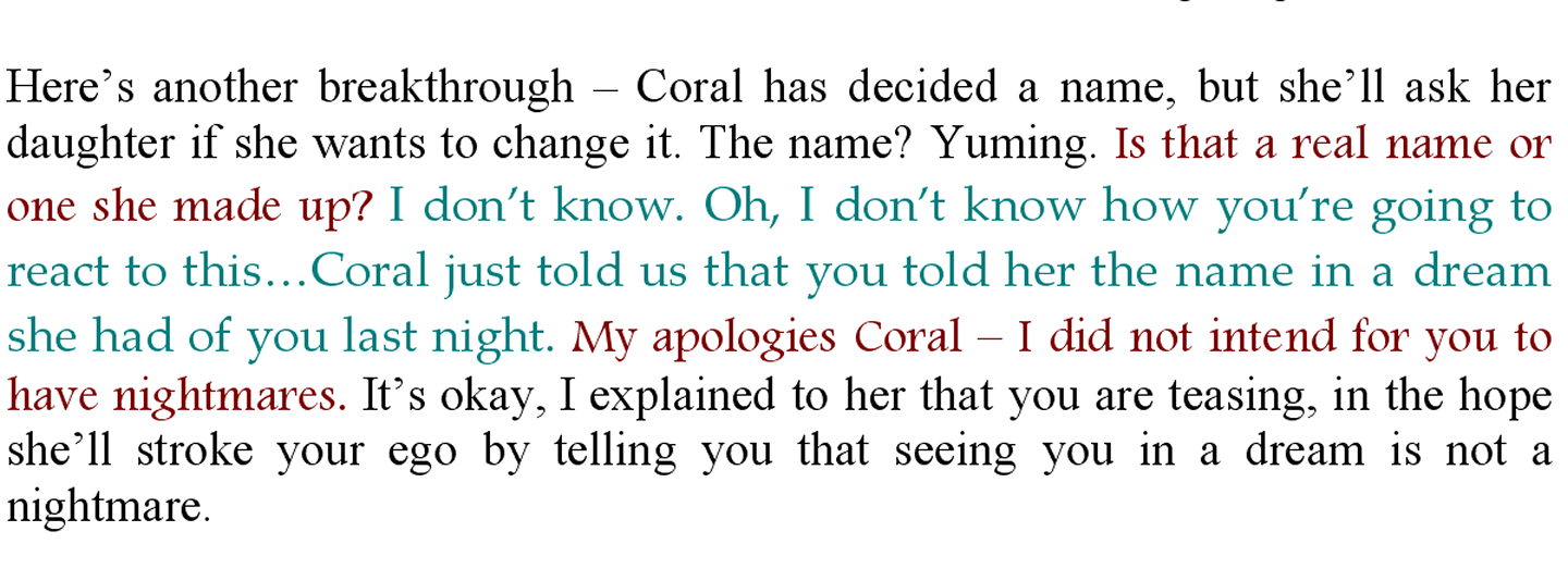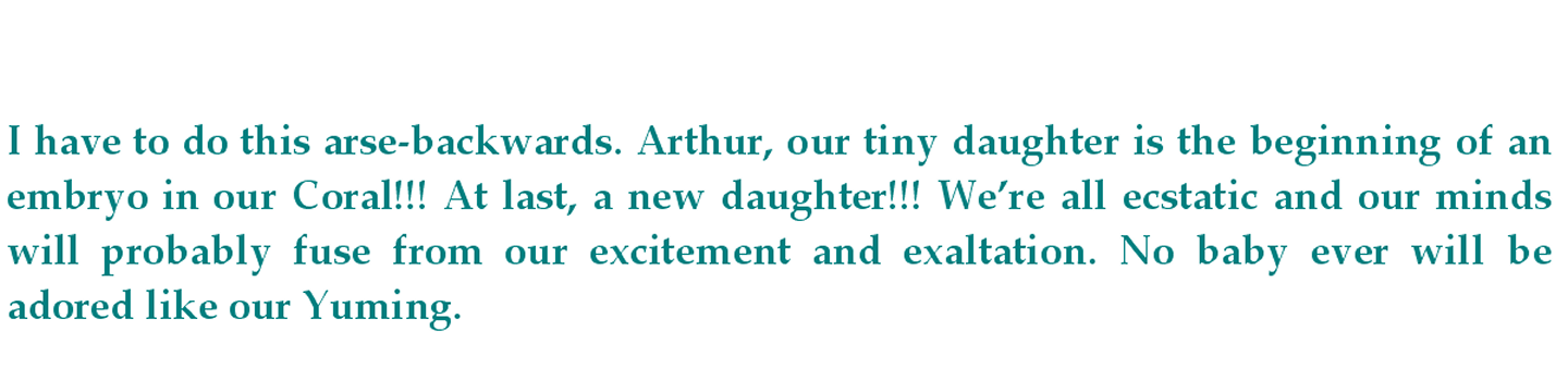 We solved our problems by having the Akiards stand among the crowd and every time someone tried to leave his seat to greet someone they’d find the eyes of an Akiard on them and they’d settle down, deciding they can wait for afterwards. The family, with our pappou, Mingzhu and Lua, gathered around Coral and the Sparklers and Unation cameras took their positions. Now came the time which nobody can control or influence - we have to wait for the embryo to call for its soul. The wait turned out to be longer than we’d expected and I quietly updated the diary.