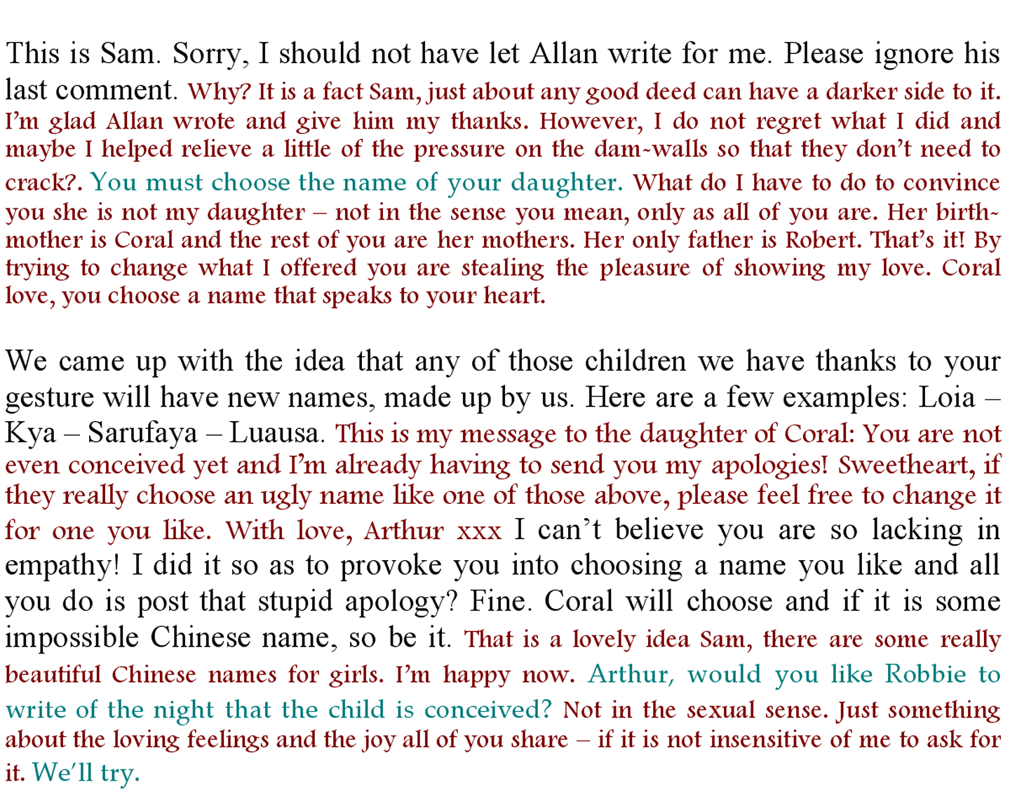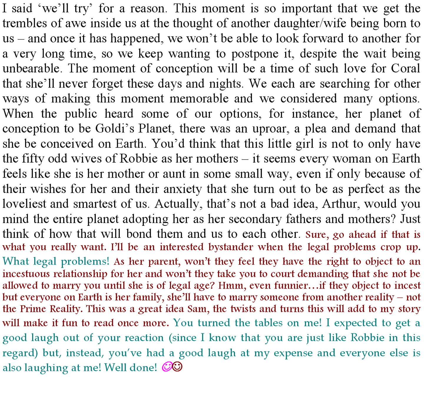 On the other hand, it has been so many years since our last child; we live those years we spend in Freddie, thus they do count when thinking of the period we’ve done without, so I cannot count only the Terran years like Sam does. I’ve had so many children and yet I still ache for more; my empathy for those of my loves who have not had even one child adds their ache to mine, turning it into a constant torture. What I’m saying does not mean I, or any one of my loves, resents Coral becoming a mother. Each of us have opened our hearts so that her feelings can flow into us; her ecstatic joy, her unbelieving feelings that she does not deserve this, that this or that love of hers should have been chosen, her guilty delight that it is her, her fears of anticipation, they flood our heart and become our own emotions. Soft-spoken, gentle Coral, beloved of everyone who knows her, how could anyone resent her being chosen. That Arthur picked her shows that without her being written of (not often), what she is still crossed the barrier of our realities for Arthur to sense how special she is.