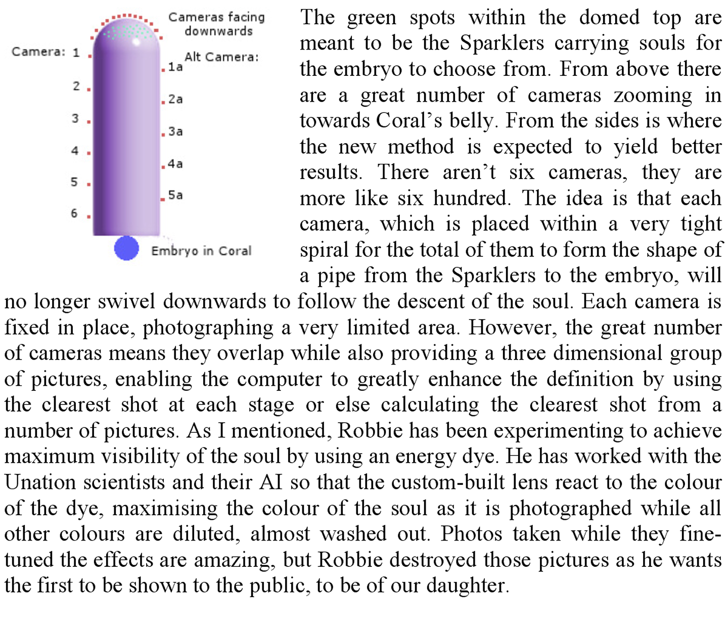 Cherine asked Coral whether she wants Robbie or the Sparklers to choose a soul for her child. She took her time thinking about it before giving her answer. “I can’t know what I would have wanted under different circumstances. This child will exist because Arthur loves us and that makes her even more special for everyone, not just for myself and Robert, or for our family or Cherinians. To choose a soul implies we rejected souls and I do not consider that in line with what Arthur wants of us. Has he not told us a number of times that we are all his children? Robert, my husband, the soul will start afresh and in that way it will not differ from any other. How she will grow, does that not depend on us? Could we allow the child itself to call for a soul at random, as it has been since the beginning of time?”