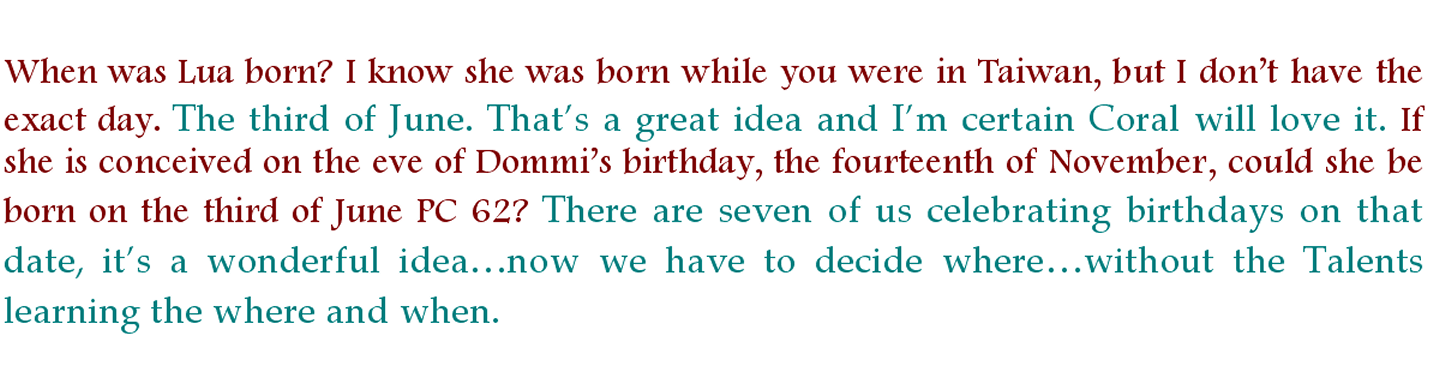 Coral looked awed at the thought. “If we conceive her now she’ll have the same birthday as Cherine.”