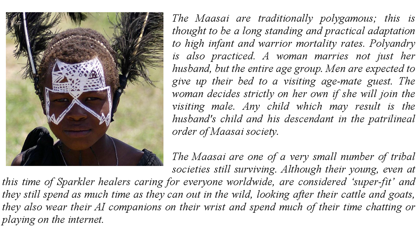 Despite our being so far ahead of the time Arthur lives in, the Maasai of our reality have not changed that much over these sixty odd years. Most of them have been educated, but a large percentage of them prefer to return to their old way of living - some say it is so because of us and the healing and food machines. Briefly, here is the little information I have about them.