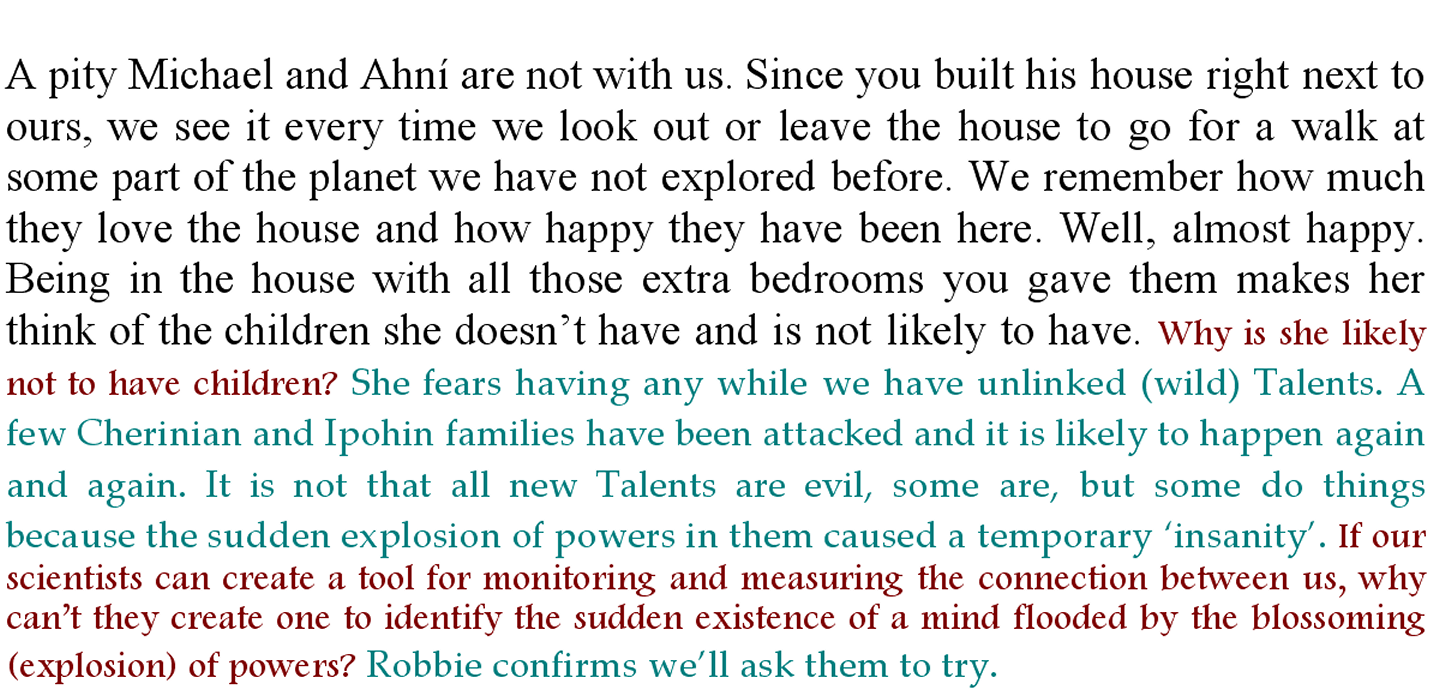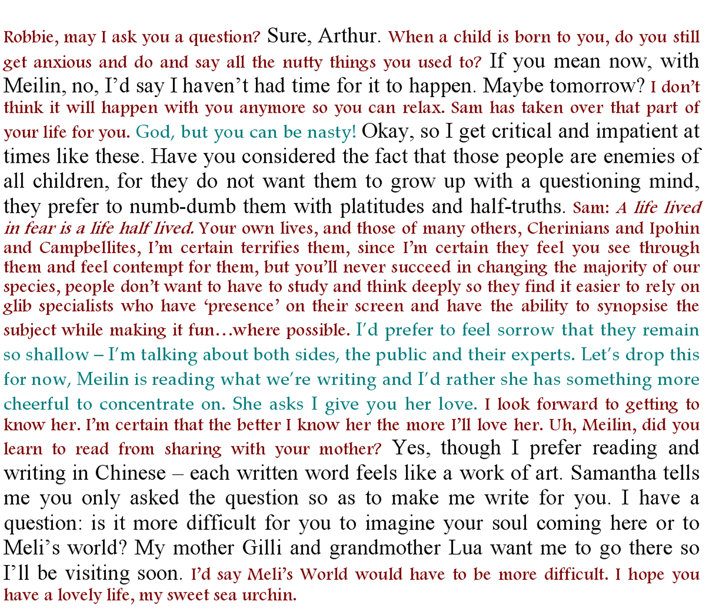 Dad got into trouble for doing the above. With the eyes of a number of Earths on us, with the demand for sharing, there was no way such a debate could have been contained to Freddie. The majority of religions are upset with us again. They are trying to be nice because they don’t want to affect the child Coral is carrying and they are aware that Cherinian foetuses can sense emotions and it has become accepted even by Normals that unfavourable emoting has a negative effect on the foetus. I’m going to stay in Freddie for the next two weeks as many blame me because I asked the questions.