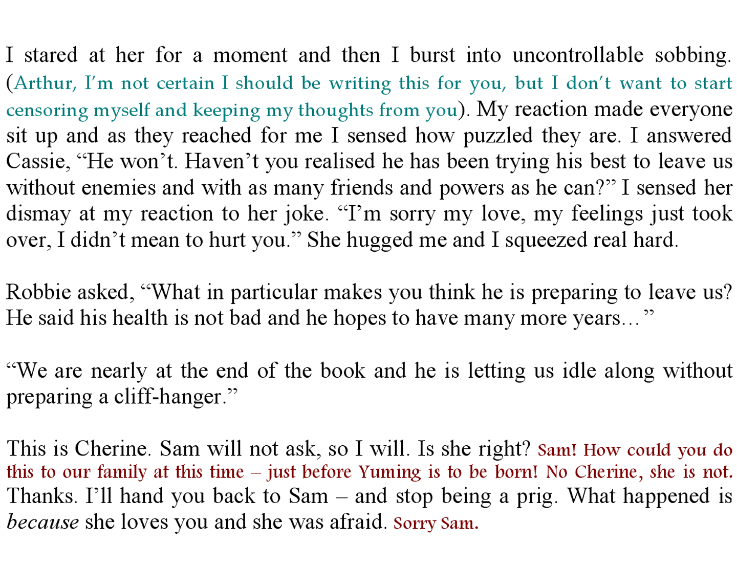 Yuming talked to Arthur Campbell this afternoon and though we were surprised, Campbell was delighted. I have a feeling that our daughter did it deliberately so as to force us to re-examine the way we see him. He has certainly done enough to prove he no longer is our enemy. I thought about it for a couple of hours and then spoke to him. “Arthur, in a way I’m glad our daughter spoke to you, but in another way, it is not that good for us.”