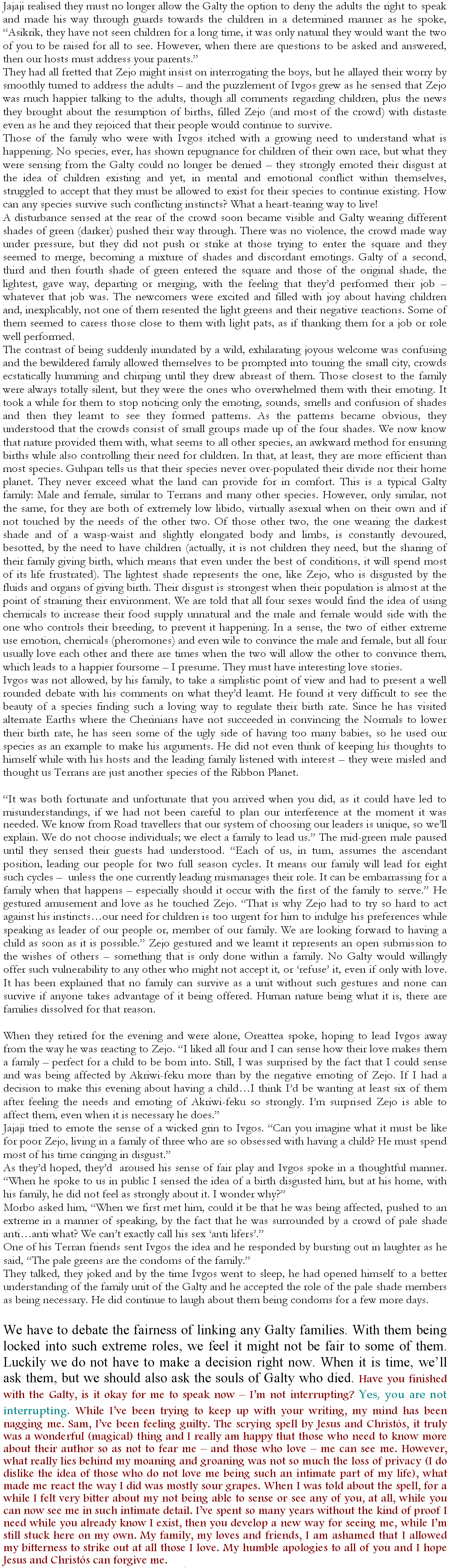 Meilin looked relaxed as she stood up to answer. “I am too new to have shared a telling from my family, but I do know that the first alien friend of my mother Samantha was an Anadir - you all know him, Ordinx. Since that time there has not been one minute that my family have had to stand alone without their Anadir friends always next to them. Some of my mothers and sisters are partly Anadir and that was the most beautiful gesture of love your people could have made. You wish for my dreams to lead me to new heights, but the truth is, an important part of our dreams is the return of Anadir to their home planet and your invitation for us and all Cherinian species to visit as often as we can…that will see us grow as Cherinians, in the way our author Arthur dreams for all his children.” We passed comments, like ‘not bad!’, ‘she’s magnificent, I can hardly believe she is a baby’ and so forth. Maybe she’ll grow up to be our first Teller politician? Meilin turned shy and as soon as she could she reverted to a baby, making both sides of her family happy when they were given their turn for carrying her.