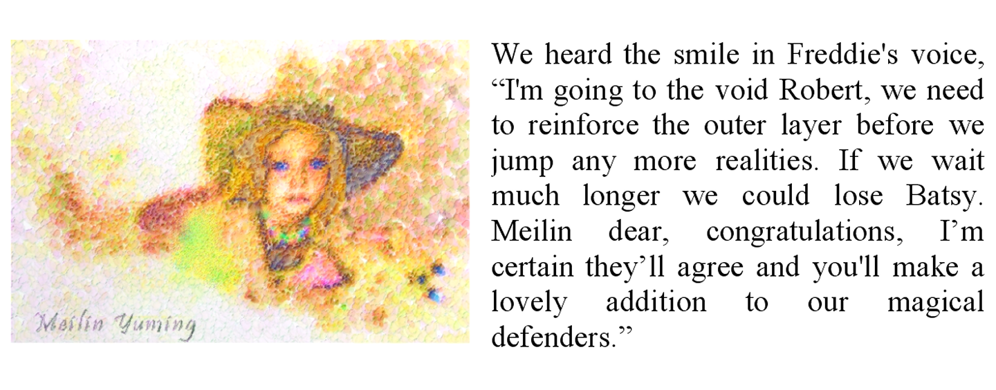 That was when you all felt my surge of joy. Meilin succeeded. She can sense the source, she can do magic!” We all rejoiced and made much of our Meilin, who now was feeling overwhelmed by our adulation and wanting to revert to a baby. We gradually became aware of Robbie and settled, in a tight cluster around her and Angelica, waiting to hear what his thoughts are.