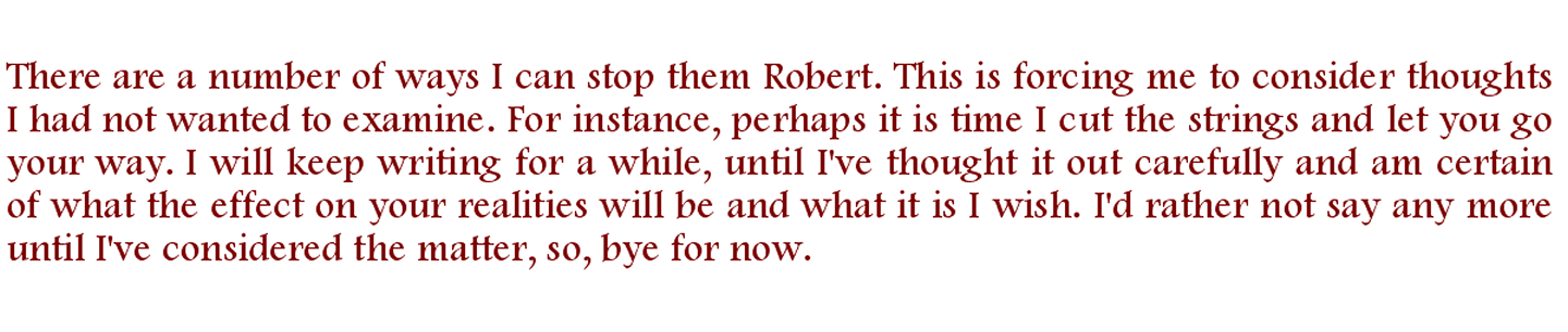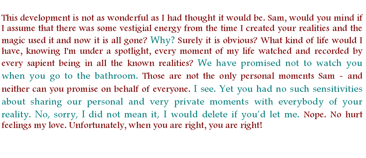 As you can see, I did not 'obey'. I guess I'm not going to be popular for some time. Arthur, you did not need the above to know what effect you are having on us, on everybody, but, by my telling you, you cannot block the knowledge from yourself. Now do as you wish.