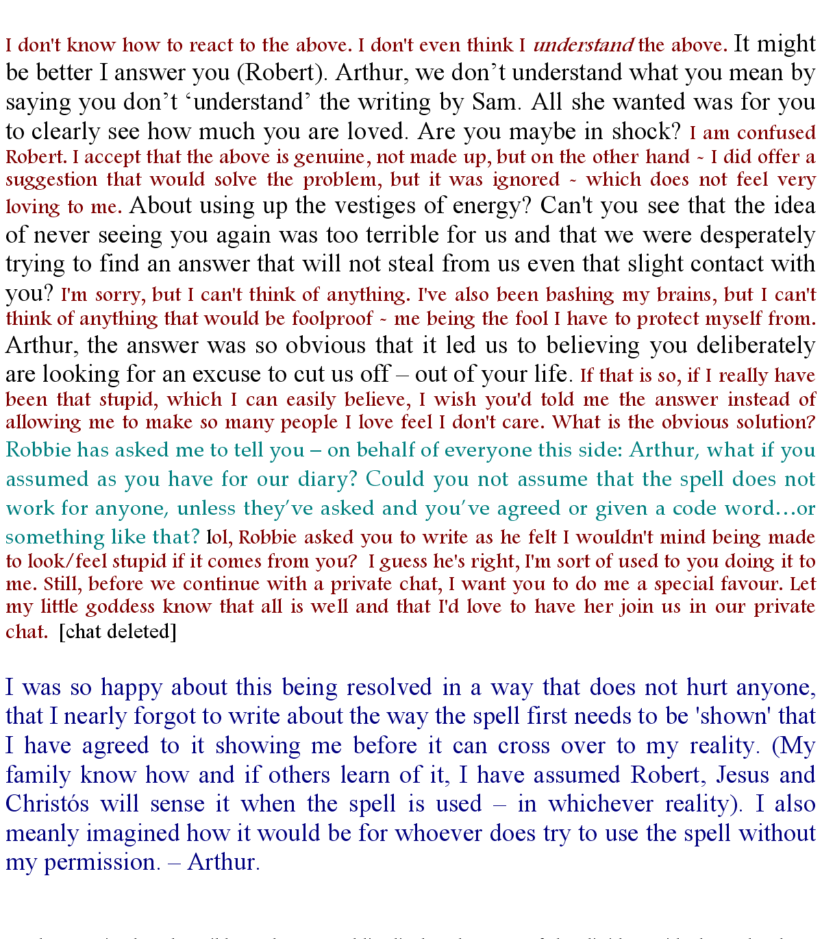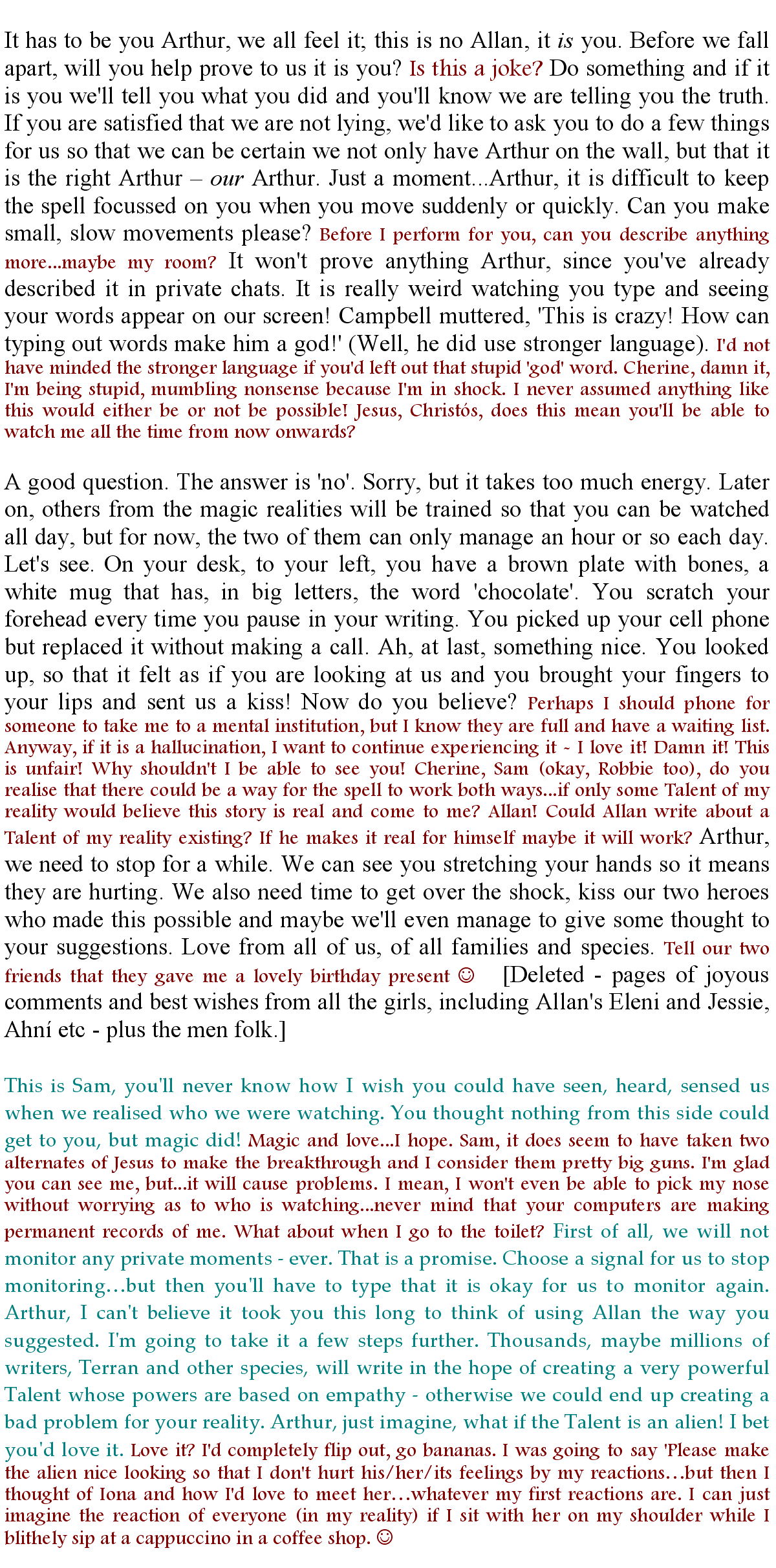 Cherine stood up suddenly, her voice stern, almost angry, as she spoke to Empathia. “Stop it!” She went to stand before Robbie and Alki. “Arthur has not turned his back on us, all he is asking is that we find a way to give him the privacy he has a right to. Until the day he stops writing, I will refuse to believe he would abandon us - not even then, for I'll keep hoping he'll change his mind. I love him too much to let him go.” As I stared at her, I could not help feeling what a pity it is she cannot split herself for Arthur, for the love a Cherine offers is so much more than I ever can.