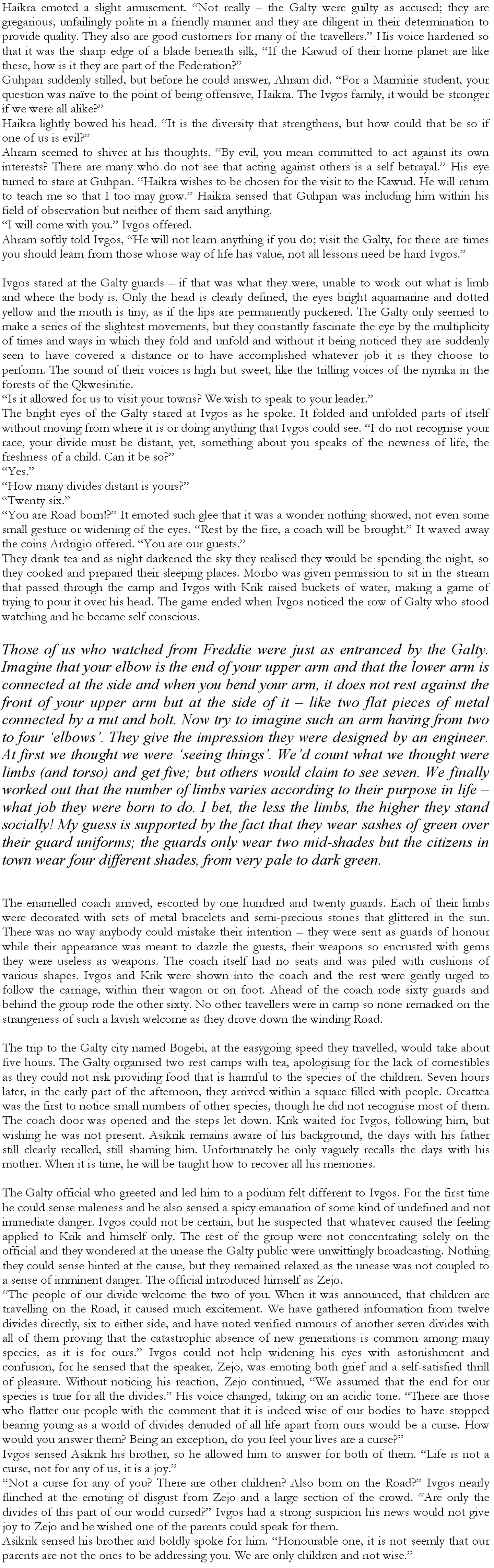 Damn it Arthur! I wrote about Lusalith and about the space fleas to give you time to get over your anger and reconsider, but all you do is type what I did. This is not the Arthur I know! Since a week has gone by - fine. Then here is some more so that you can finish your book, for you to stop writing - since it seems to be what you've decided.