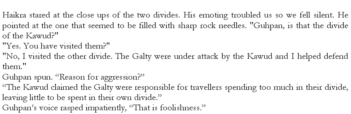 Ardrigio queried Argidsi and then replied, “Since being linked, you have grown more sensitive than most of us. Perhaps you are sensing something they do not wish to discuss with us? Unless they decide otherwise, it would not be polite of us to show we are aware.” Red-faced I pulled out, blocking them off. As soon as Ardrigio and Ivgos returned I told them I'd overheard, listened to them, as I'd not realised they wanted privacy. Argidsi fluttered her eyes, the blue showing momentarily, but Ardrigio remained lost in thought. He suddenly met my eyes and I sensed him, he was waiting for me to explain.