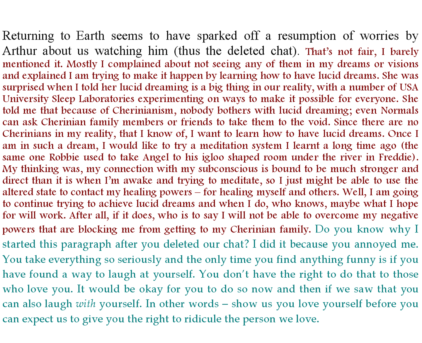 He waited five years, built himself a new life within that period, but also practised jumping to other realities, concentrating on arriving at the time period he chose. He then published his autobiography, which gave all the details of his pre-Cherinian life. It caused a great shock - especially the fact that he had bamboozled the prime Tellers. His book was quite a hit in our reality and when he jumped, arriving fifty years after his departure, he was a celebrity and appeared on chat shows. Nobody was willing to prosecute him. I think his return was not all he’d hoped for; even the best reality usually fizzles out when your expectations and dreams make more of it than is possible, plus his memories of living a life with meaning made him yearn for the Earth and friends he’d left behind. Not confident he would be welcomed, he visited us to ask whether our alternates would welcome him back or are they angry with him. We convinced him to return and he is still living there.