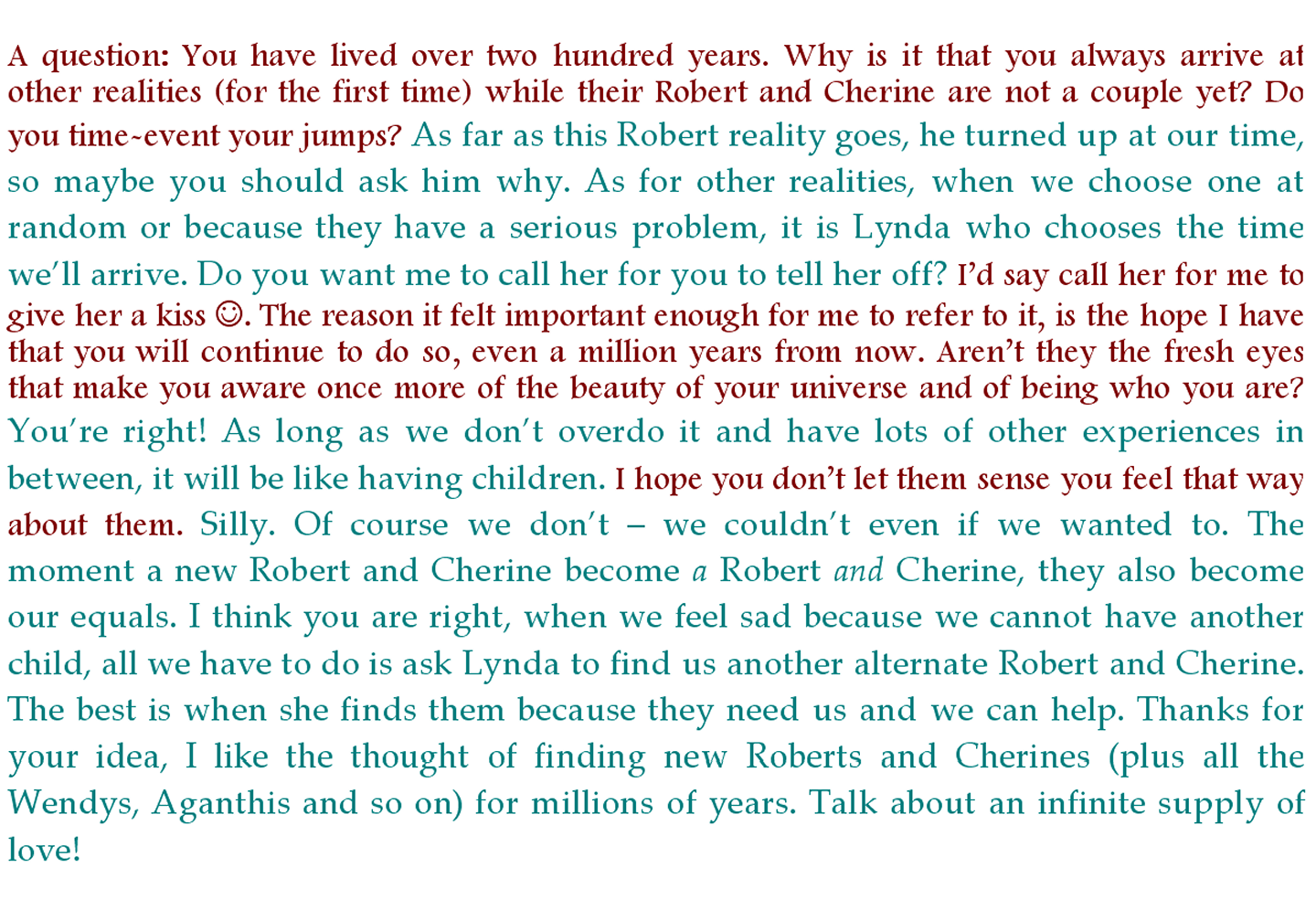 We will return to your reality, at the same time we departed, so that you can watch and learn. However, if you are both not fully aware of what possibilities exist for you, then you cannot make sound and healthy decisions and what you see will destroy you. We are first going to share with you the experiences of our family - my loves will do a telling for you. When it is finished, then we’ll return to baby Robert and when you suffer, you’ll know that you do not suffer alone, there are billions of Cherinians in Freddie and the Sparklers Worlds and they will suffer along with you. You’ll never be alone again, that is our promise.”