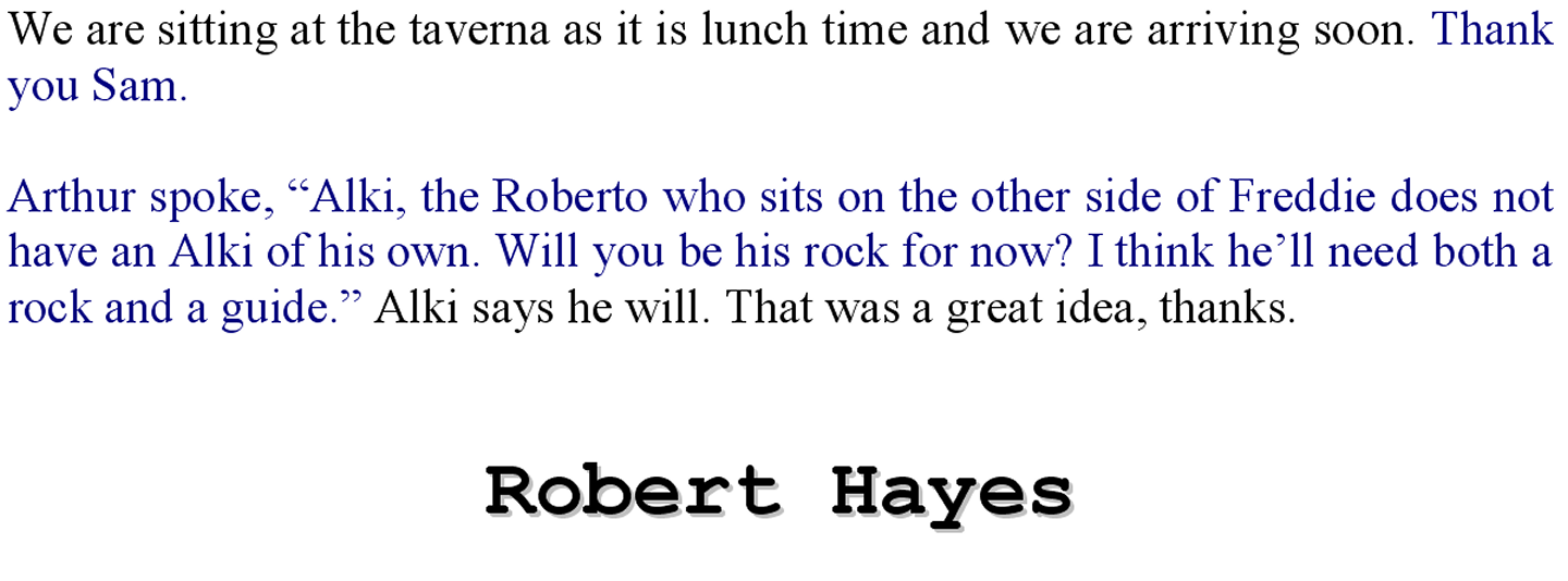 He pulled back. “What joy? I don’t know him and he damn well doesn’t know me. I don’t want to meet him.” Only his Cherine is allowed to hit him and their relationship has not developed to the point where she can do so - more’s the pity. Alki did not give in to Robert’s self-pity, kept calm and talked softly but insistently until Robert gave in. They arrived about fifty metres from the taverna and walked to a table together, to find a whiskey for Alki and a cappuccino for Robert waiting.