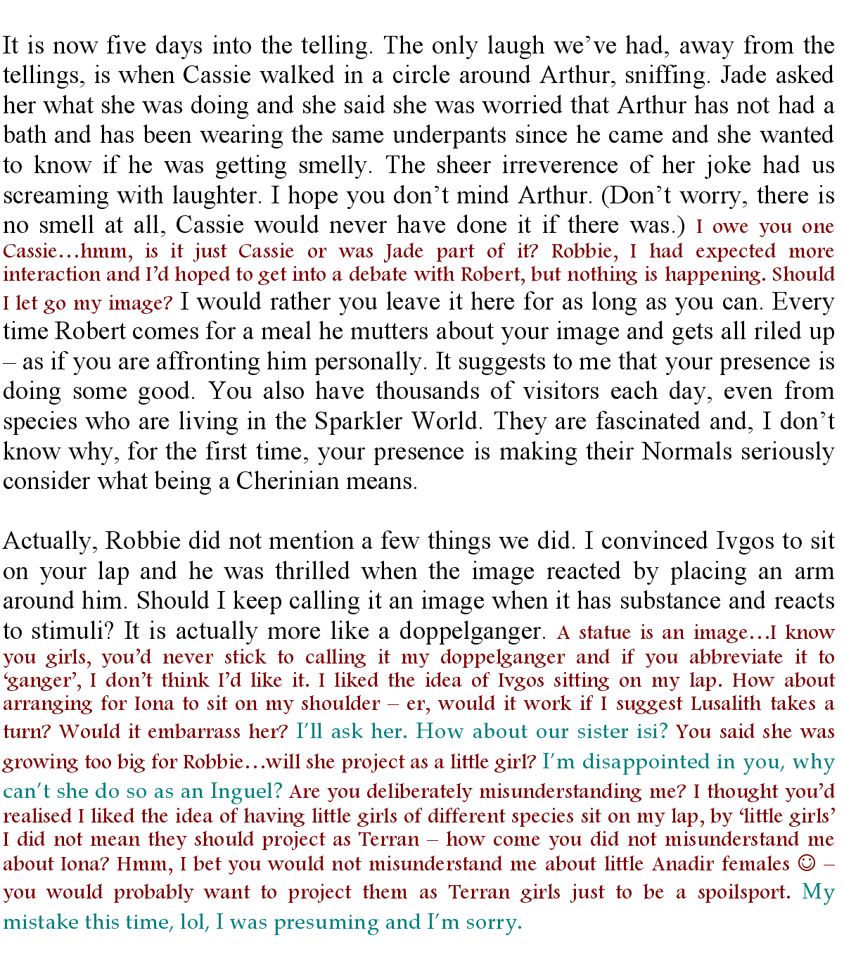 It is difficult to notice changes in Robert because of his emoting a need for privacy almost all the time. The day after the telling finished we visited another Earth, enjoyed the warm welcome and returned to Freddie. Haven noticed Robert staring at the image of Arthur and drew our attention to him. He came within a couple of feet of Arthur, staring at him from close up. Tentatively, he reached out and touched the left hand as it rested on the table. He turned and looked at us as if to say, ‘look, I’ve touched him!’, and then he walked into the grass and bush and was soon out of sight. The Akiard kids were aware of his walking in their direction and they sent to Cherine that they will stay out of sight, unless they sense he wants to meet them. He walked for days and whenever it was sensed that he needed food or drink, the taverna robot took it to him. To Robert, the robot is just a machine so he did not feel its presence intruded upon his thoughts and his need to be alone.