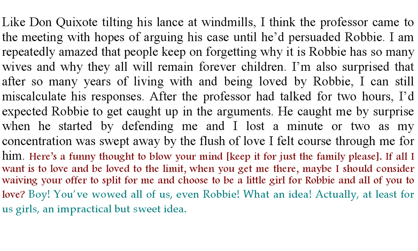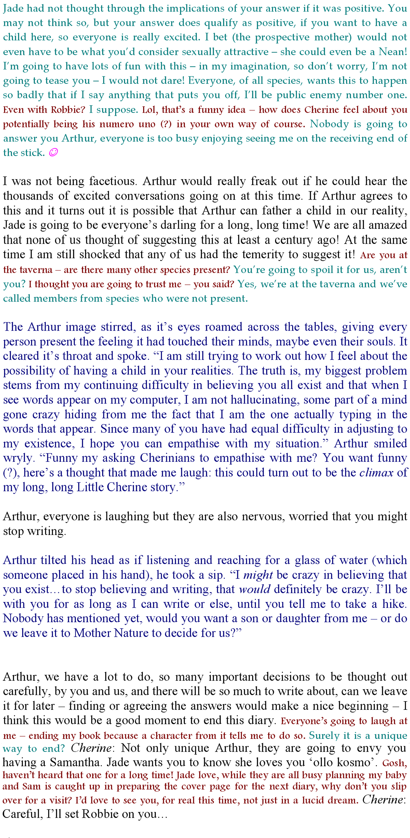 I have immersed myself in the tellings by your family a number of times and have shared experiences of the re-enactment of the meeting between yourself and Cherine in the Sparkler World. I do not claim such studies give me a special understanding, but I wished to let you know, in advance, that I do not lightly put forward my questions.