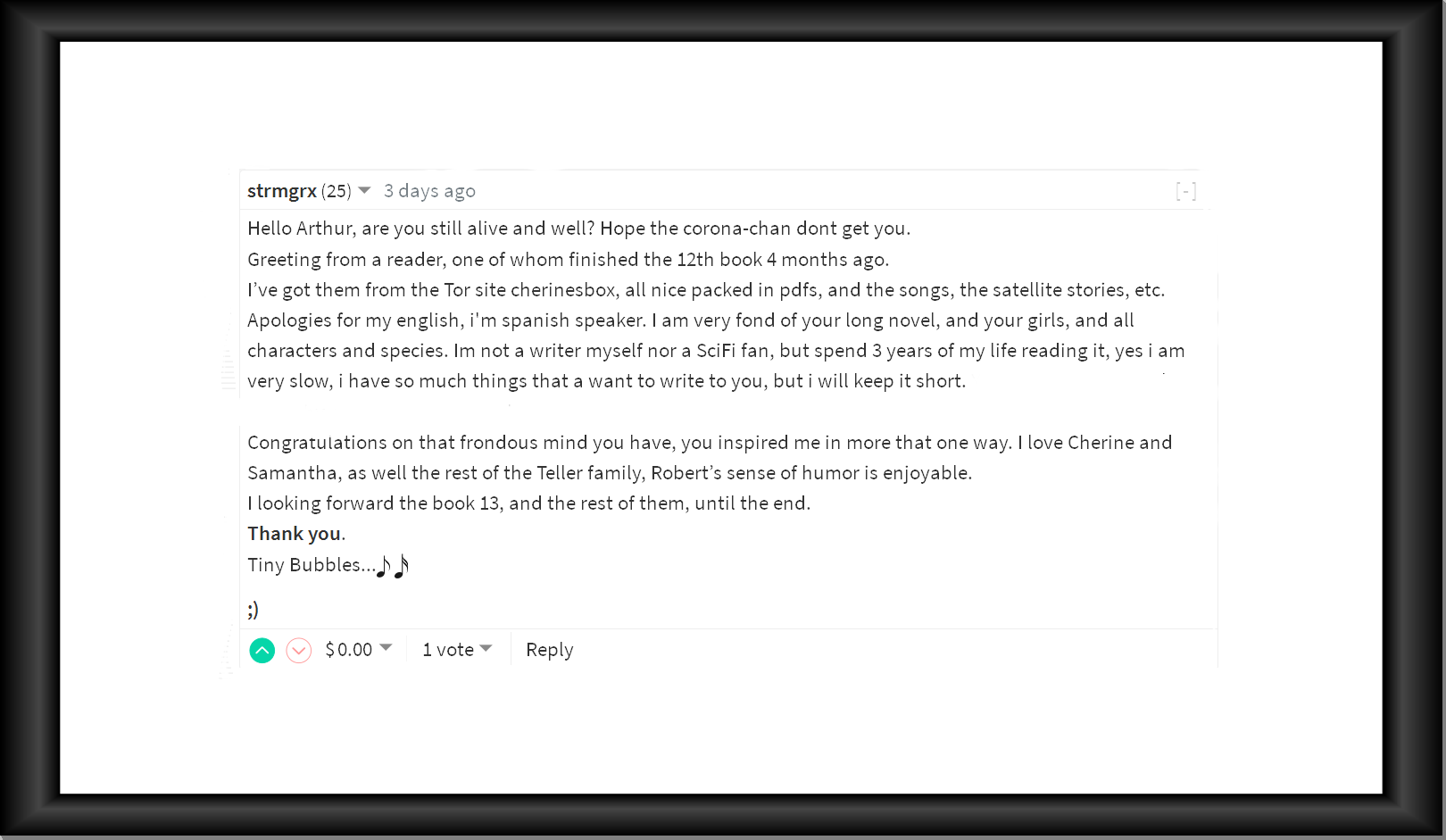 Greeting from a reader, one of whom finished the 12th book 4 months ago.