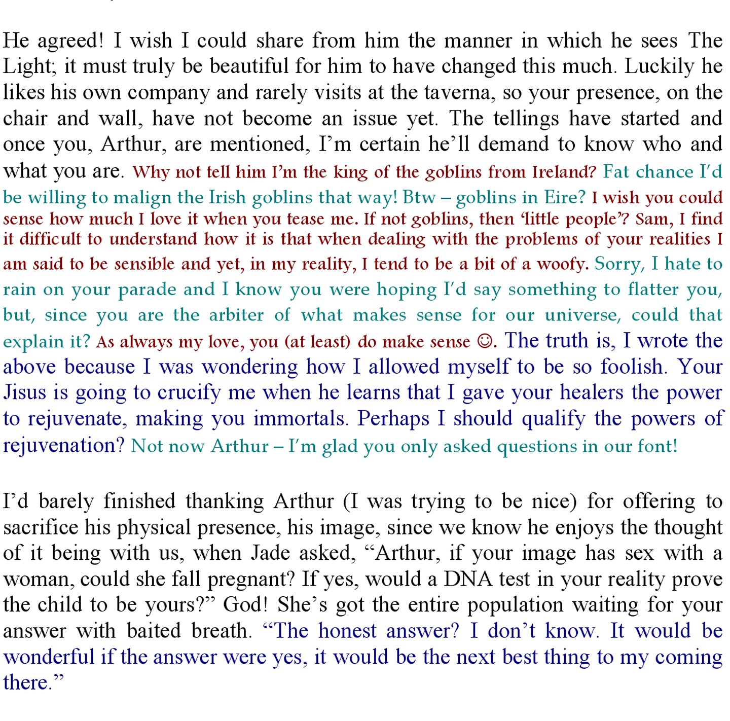 Cherine arrived with him in front of your image. She saw he did not react to you, so she pointed at you and told him, “It is not time, there is much you must learn of us first before you learn of him. When you do, it will shatter you Jesus.” Her eyes turned to stare into his, her face gentle but glowing. “Whatever you may think about those you’ll meet, you do not have one enemy in Freddie - so meet them with love. When it is time to speak of Arthur, I promise to return.” Before he could react, the glow died and our eight year old Cherine stood before him. He actually shook his head, as if not believing what he’d just experienced. Cherine took advantage of his dazed condition and taking hold of his hand, she led him to sit at Robbie’s table. A glass of red wine and the rest of the bottle were placed before him. He kept his eyes on Cherine as she made herself comfortable on Robbie’s lap and only then looked at Robbie. Robbie waited for the question he sensed Jisus was holding back.