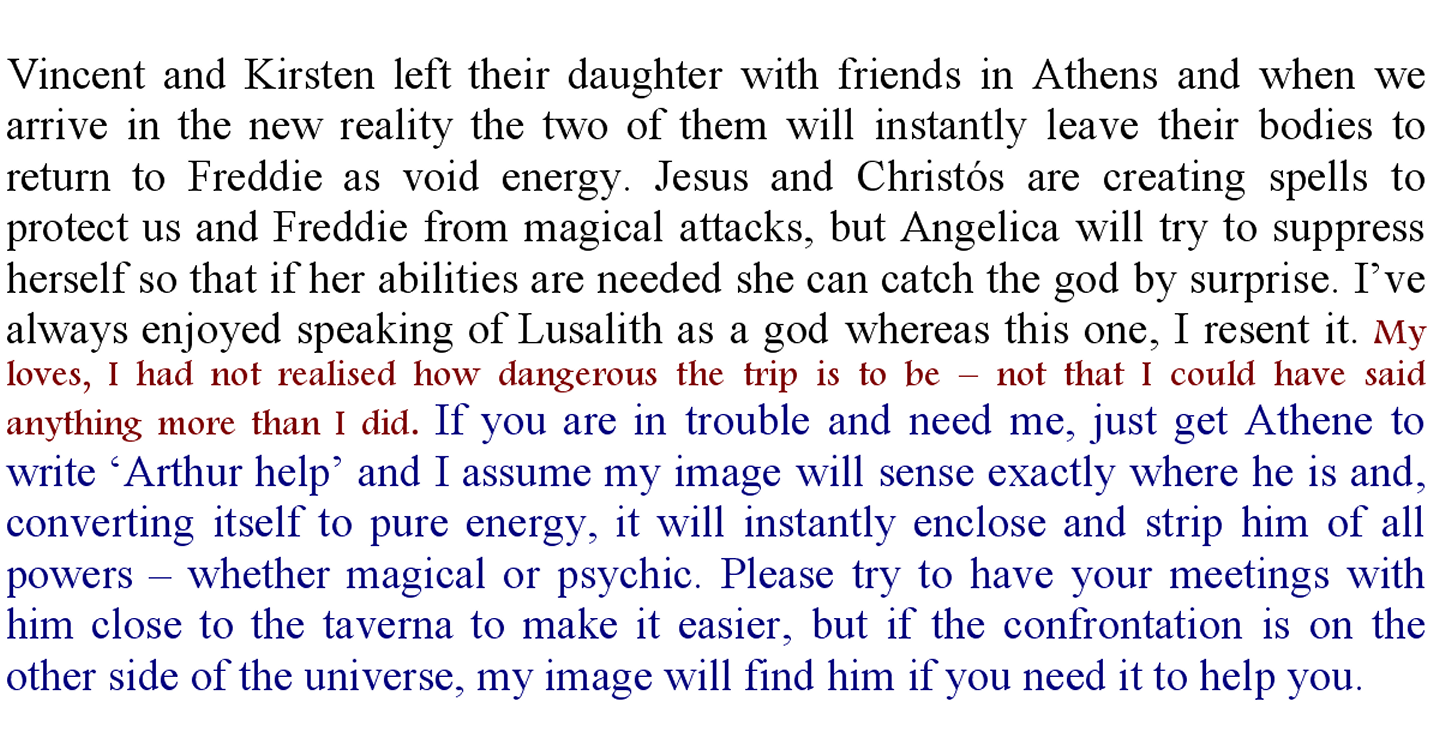 We’ve decided we have to go, but we are taking reinforcements. Both Jesus and Christós have joined us and Michael and his family, with two of his most powerful Ipohin and, of course Campbell is still with us. Lusalith and Ivgos are also in Freddie and I’m certain every Talent is potentially useful as we don’t know what his powers are. Before we leave, I think you deserve an explanation of why we feel we have to go. Apparently the god is Old Testament style and is very intolerant of those who do not obey all his commandments. He has stifled all progress and it is a miserable world for those who have to live there. Once Lynda searched his reality for him, she became aware of a few things we had not been told (a Sparkler-Anadir team reported this reality to us. They did not stay long enough to get any details as they were worried the god of that reality might become aware of them). We know that the god is a Terran, but Lynda did not stick around long enough to get a feel for him so we don’t know whether he is a Talent we already know. She also sensed that he is totally ignorant of the possibility of other realities and she says she thinks he is not well educated.