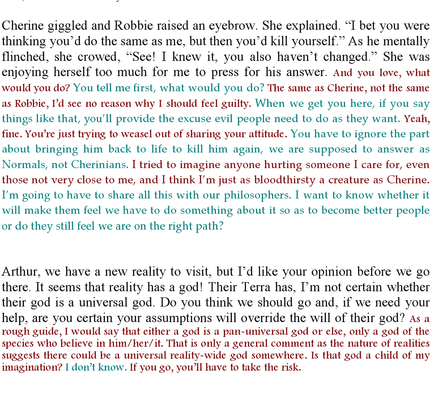 I’m not even going to try to thank you. I should have mentioned that the details of our mission leaked out (why is it that Cherinians can’t stop themselves from gossiping?) and leaders of Christian and Islamic churches asked to come with. We refused all of them, explaining that we will try to bring that person to visit, but until he is willing to relinquish his ‘divine’ authority, we cannot weaken ourselves by having people we have to protect. We are now in a dead reality. We’ll sleep here, have our breakfast, set up everything as planned and jump to our destination. We intend arriving in normal space, but far enough from Earth that it is unlikely the population will notice us. We know ‘he’ will.