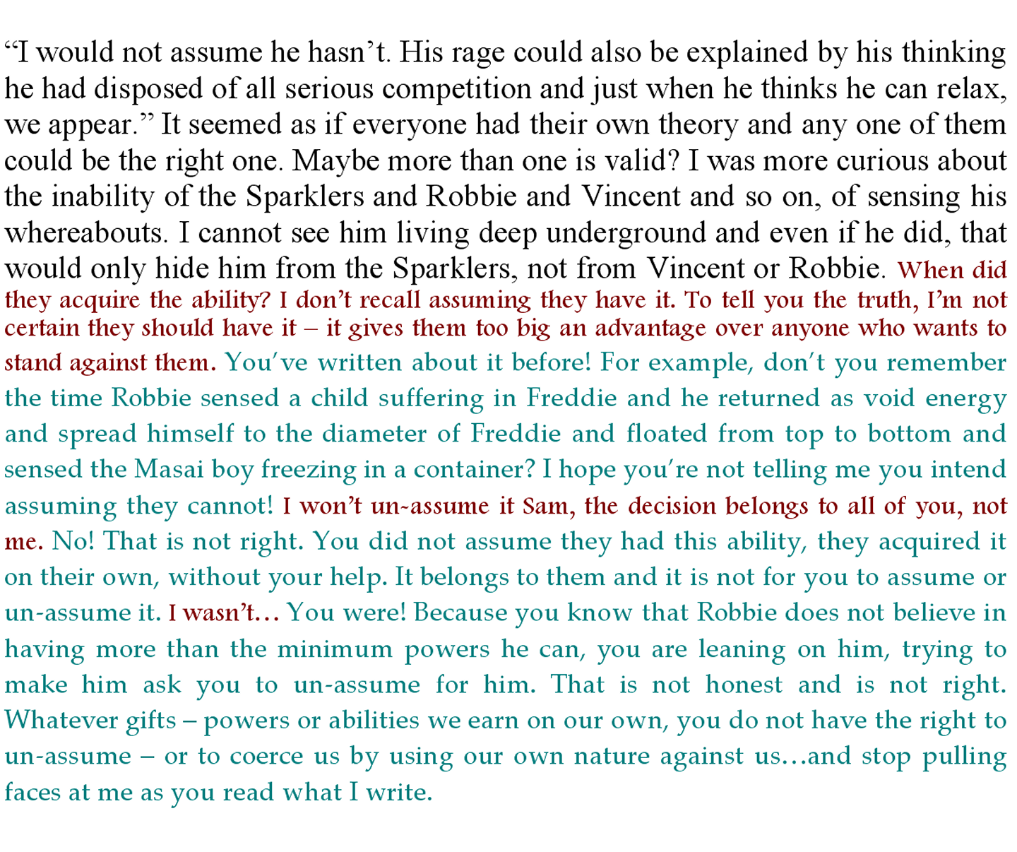 While the above was happening, hundreds of millions of Sparklers were searching for the one I’m calling Jisus. I was not perplexed by his disappearing act, not per se. I mean, he would have to be pretty dumb not to have prepared some safe places. What did confuse me is his ability to block his mind and emoting so effectively. Why would he develop such an ability if it is not needed. Does this mean there are or have been other Talents? Does he kill them or does he burn out their powers? The more I thought about it the more sense it made. He has convinced an entire planet he is their god. That means he must always be invisible, even should someone bump his head and suddenly become a major Talent, Jisus cannot confront them openly.