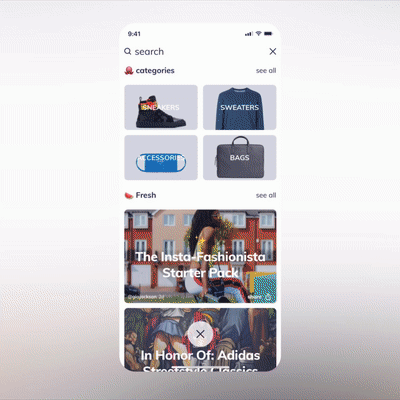 Stories put product streams into a cultural context. All stories consist of a least eight themed product streams put together much like a playlist. Here, wysker strives to stay atop of current and trending topics to keep the app relevant for you. When a story is especially exciting, you have the option to turn it into a GIF and share it on social media. This is an especially unique aspect since sharing stories tells a whole different story than simply sharing a single product. At the top of the explore screen, you can also search for specific brands or product streams and browse through various categories.4. SHOP