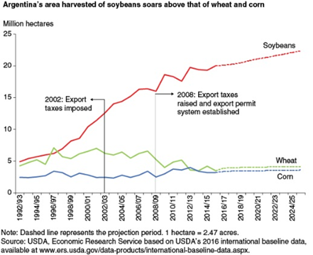 Anyway, you can see how the uptick is in the last five years. Argentina continues to go up, but look over in the far right. Those are the most in-demand goods in China right now: corn, wheat, and soya beans. The jump on the soya beans is outstanding, and so everybody is trying to capitalize on this.