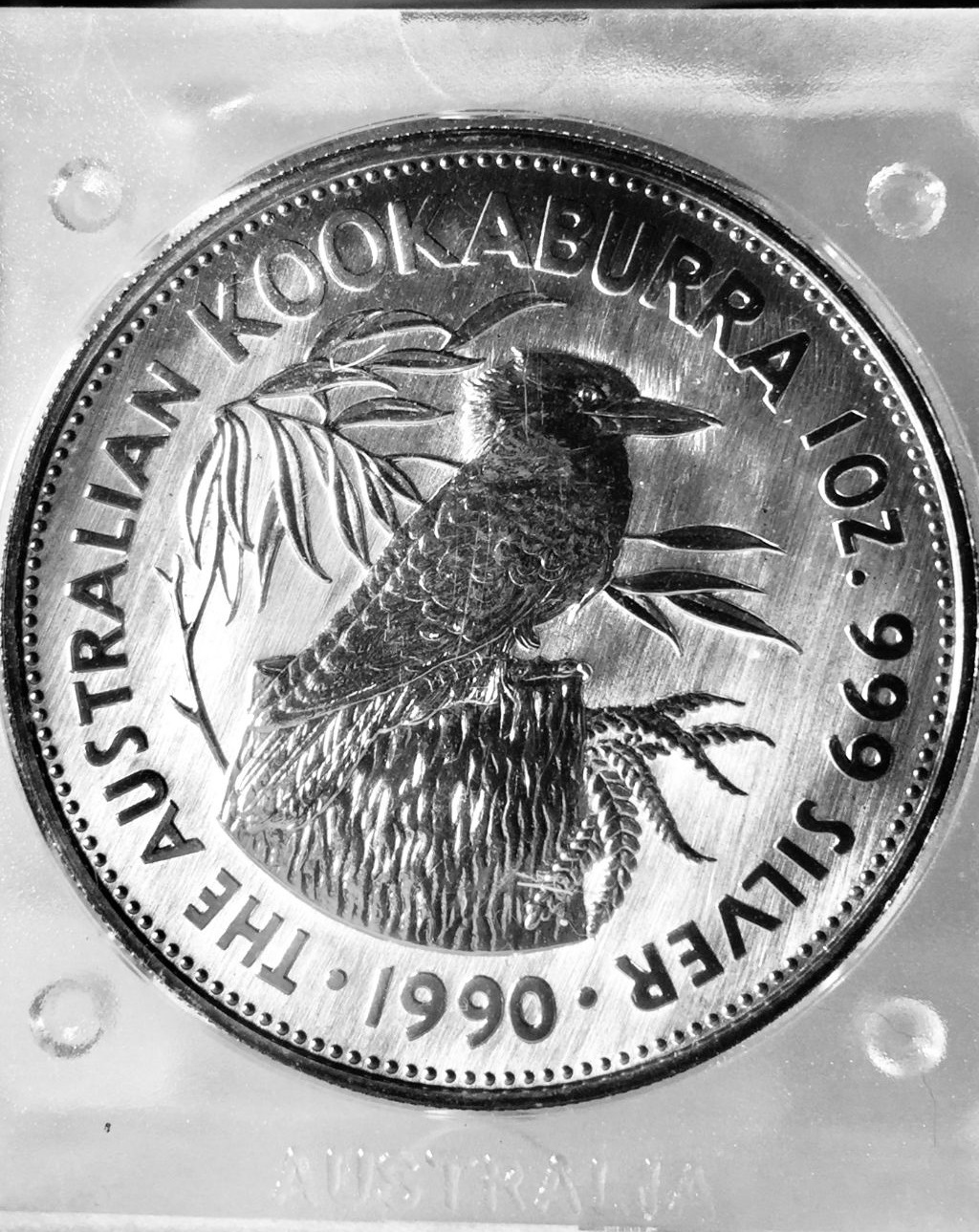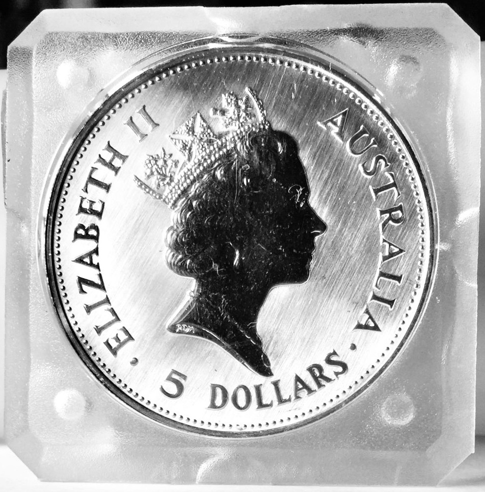 This Australian Kookaburra Five Dollars, is backed with one Troy Ounce of 99.9% pure Silver.