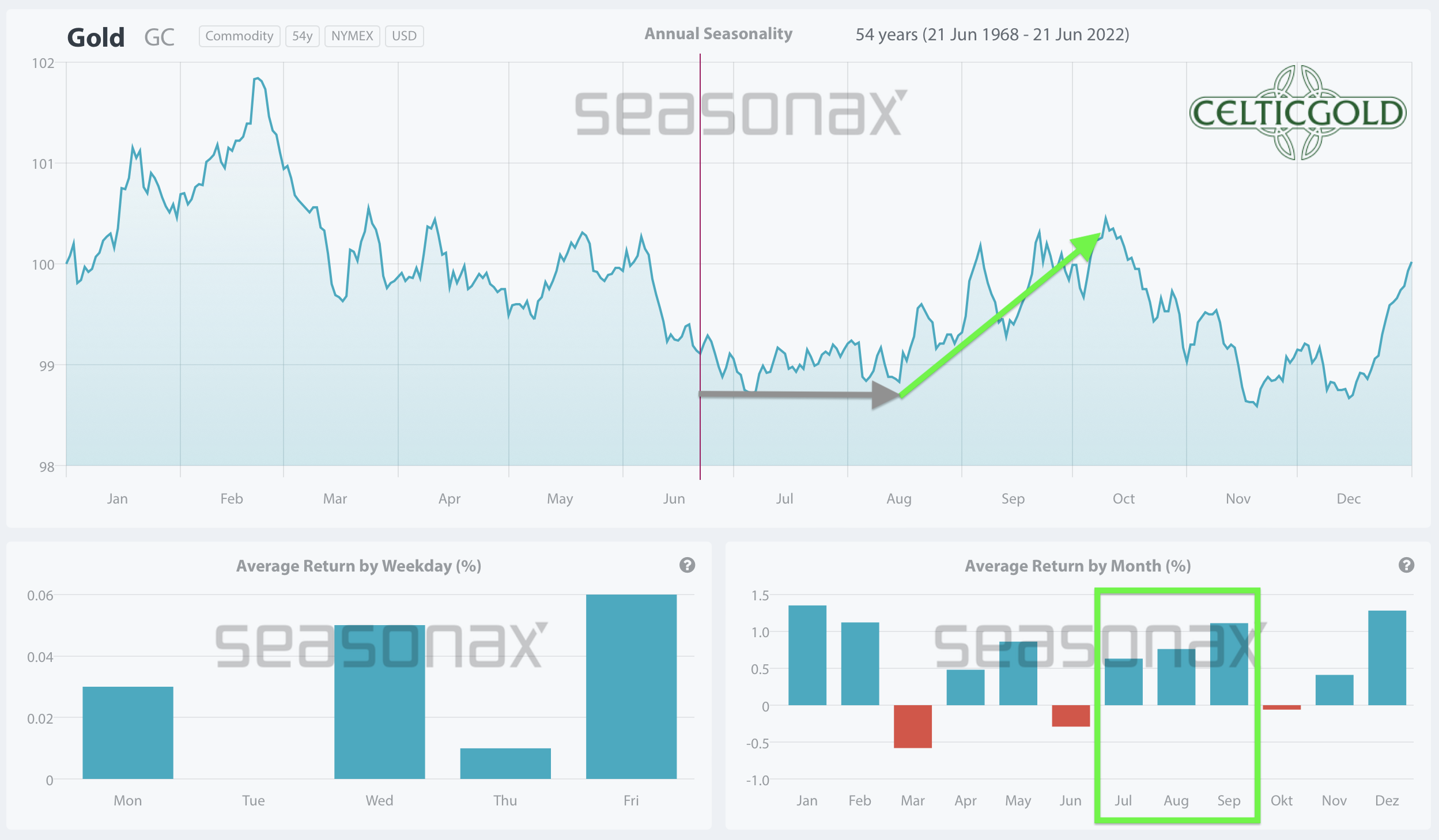 Seasonality for Gold over the last 53-years as of June 22nd, 2022. Source: Seasonax