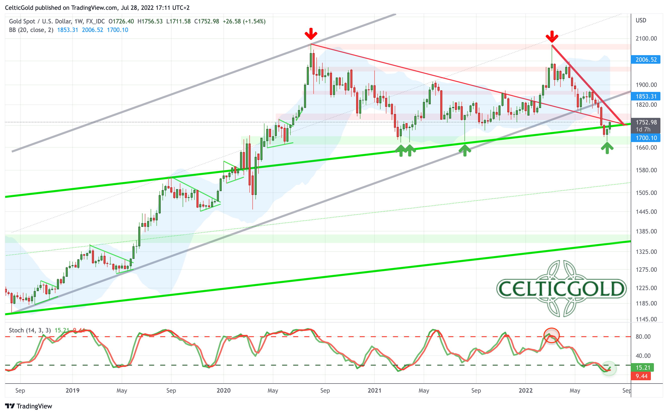Gold prices reached an important high on March 8th, 2022, at around 2,070 USD and have since then slid into a brutal sell-off over the course of the last three and a half months. The final low of this wave down has been seen on Thursday, 21st of July, at 1,681 USD. Thus, gold has lost almost 400 USD or 18.8% in a rather short period of time.