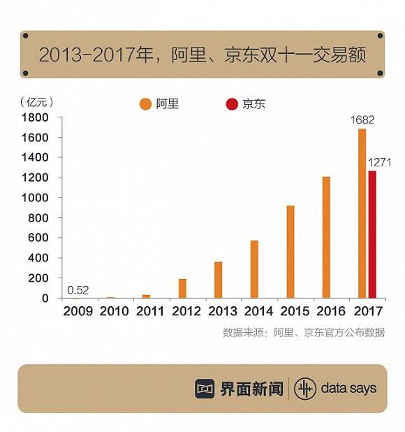双十一,一场盛况空前的营销大战。为了备战双十一,天猫把双十一晚会当春晚办,而京东则联合腾讯共同奋战。所以,在各种优惠券、抢红包活动的造势之下,2017年天猫双十一的销售额达到了史无前例的1682亿人民币,而京东的销售额也达到了1271亿。