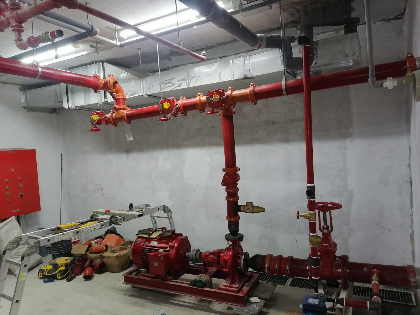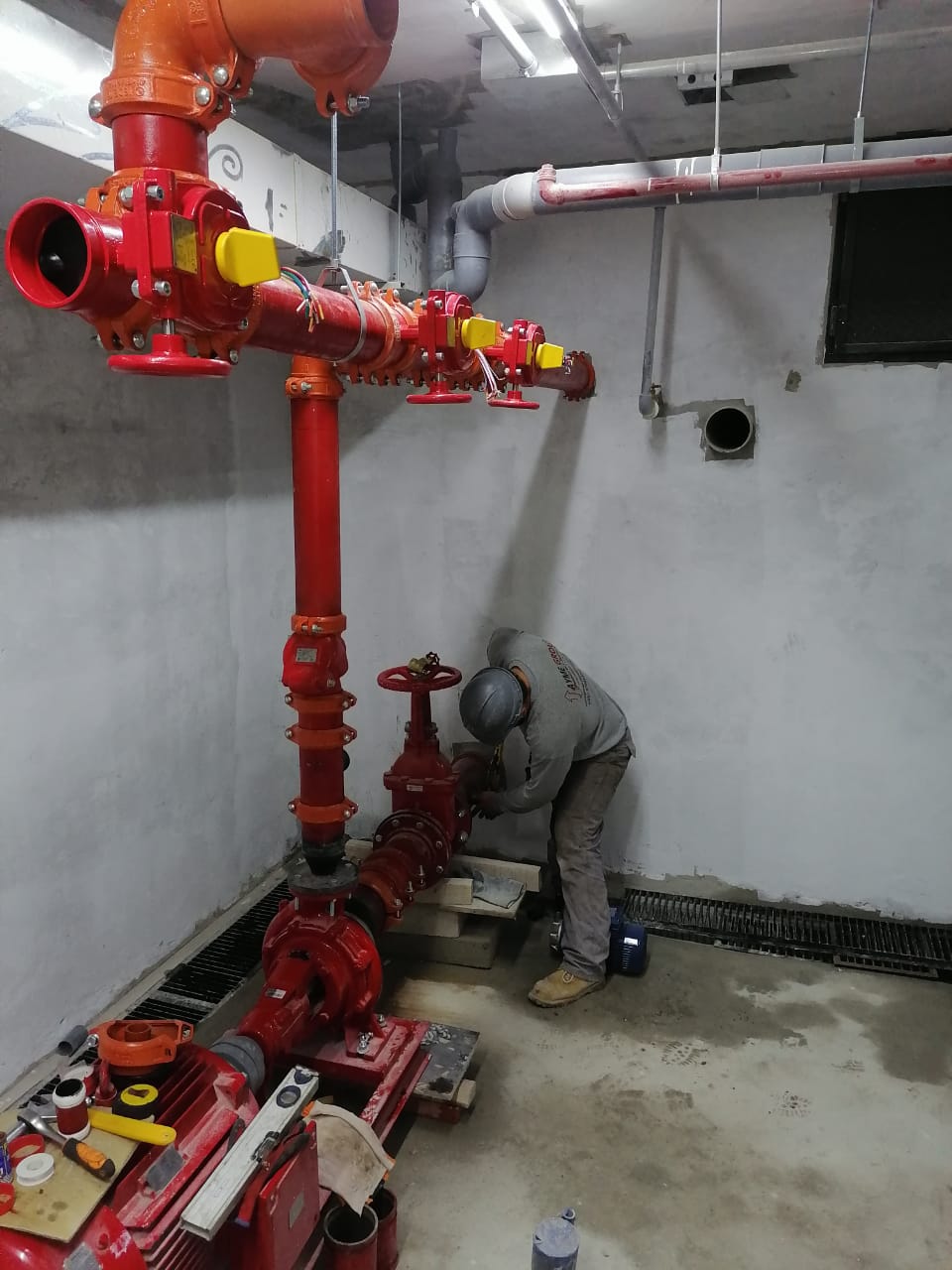 Vengo a presentarles un poco de mi trabajo de sistema contra incendio, realizado el día sábado en un edificio comercial, estamos instalando una bomba de 55 HP para un edificio de 11 pisos. Con tubería principal de 4 pulgadas, tuberías de 3 pulgadas para las ramas y tuberías de 1 pulgada para los roseadores con