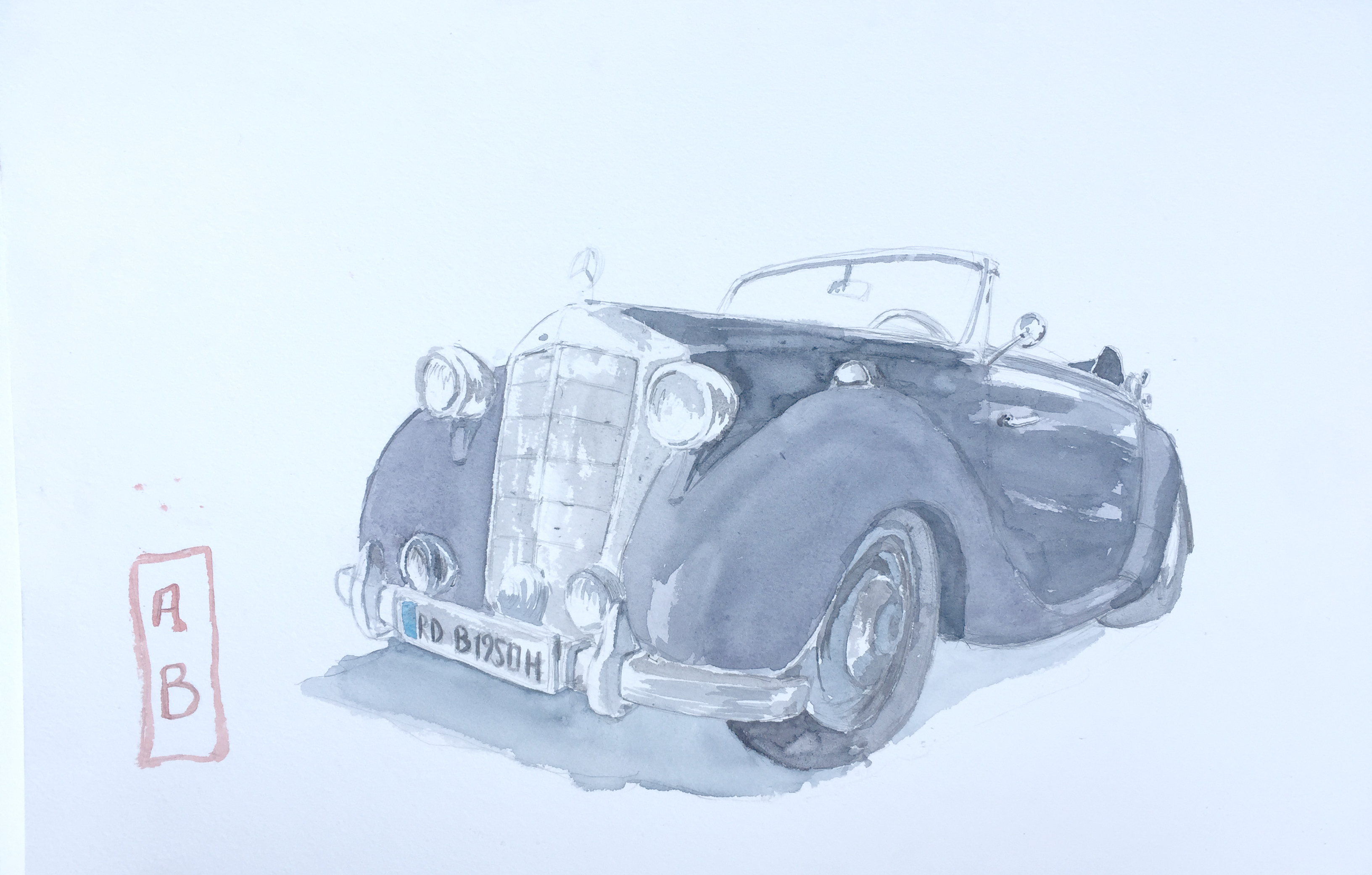 The color of the car was black. Ivory black. As I am very far from Manet or Velazquez, two great painters who mastered black colors, I decided to dive my brush into a mixure of Payne's Gray and black. Just as a recall for watercolorist, Payne's Gray is an extraordinary pigment which can either be used to give some cold shadows strokes or to desaturate other pigment without ruining their initial hue. It's a must in my watercolor palette.