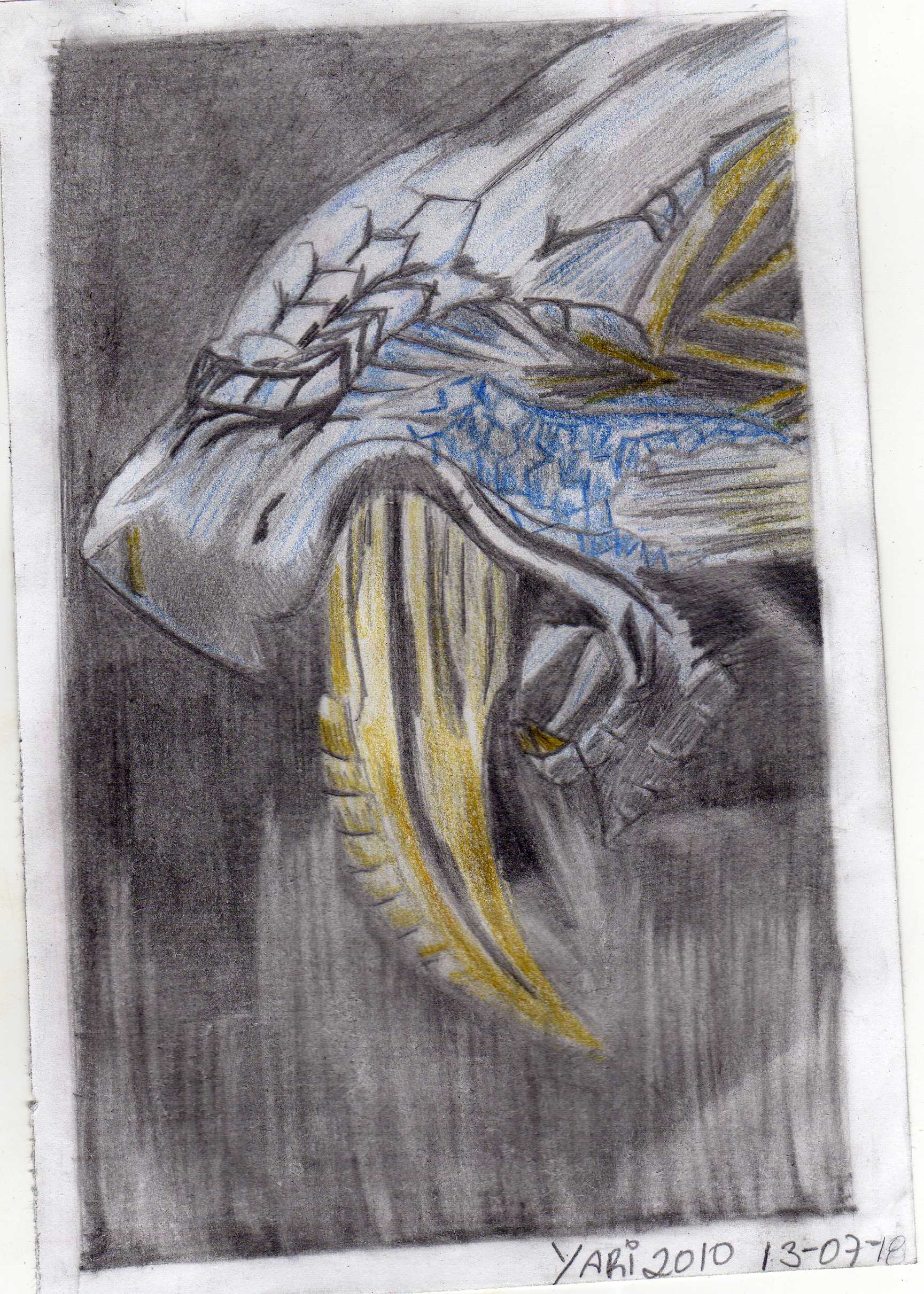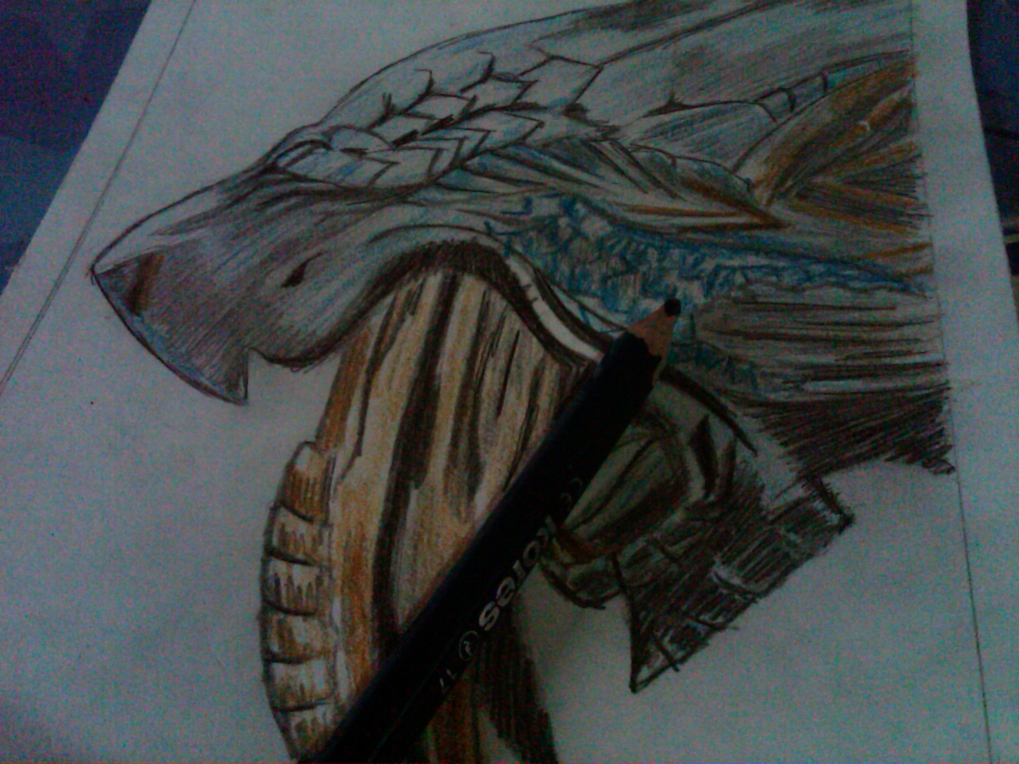 Feliz día mis amigos, quiero que observen este dibujo que realice de un tigre dientes de sable, este dibujo lo realice inspirado en la película de Diez mil A.C, en la escena del combate con el tigre, aunque este diseño es de mi imaginación, quise ser totalmente imaginativa y agregarle unas escamas y hacerlo de color azul para que se viera de forma agraciada, también le agregue un poco de negro y dorado para decorarlo.