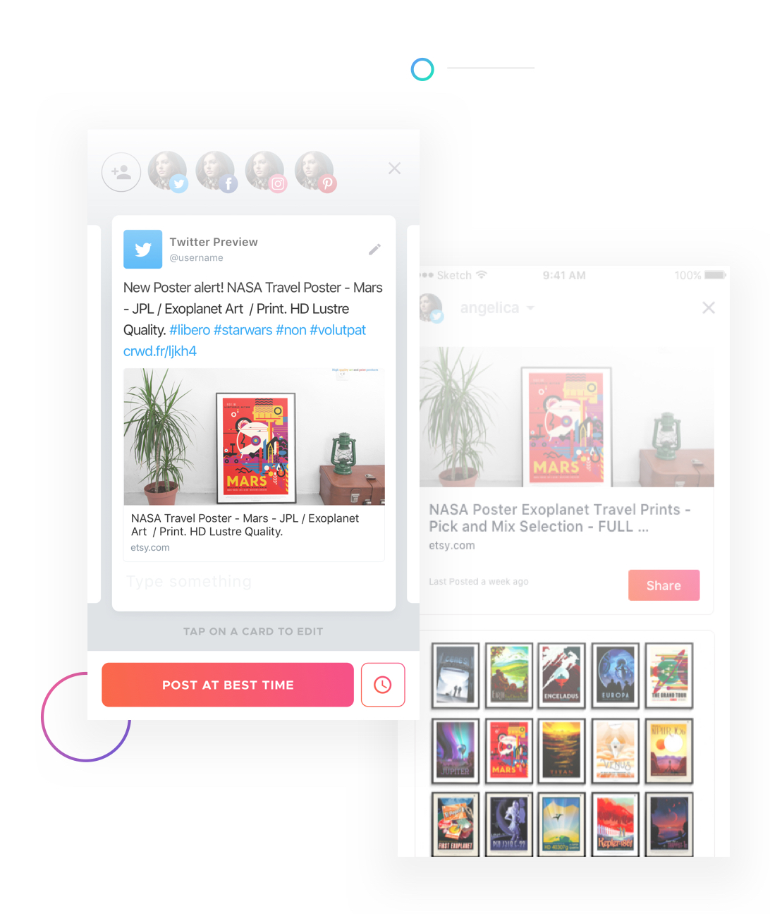 Keep an eye out for updates from your website, blog or online shops and create quick, beautiful posts for every update to easily share on all your social profiles!