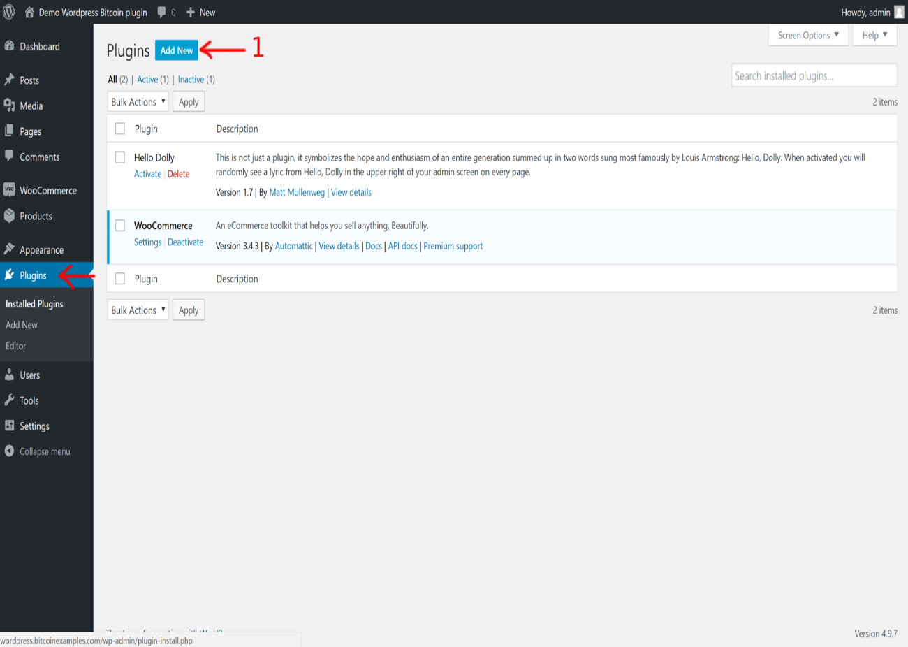 To do this, first at all, you must have a bitcoin wallet in order to receive your funds. Keep your bitcoin address carefully with you at all times! This will be your cash register. When created, log in to your WordPress admin panel and go to Plugins -> Add New in the admin panel. (1)