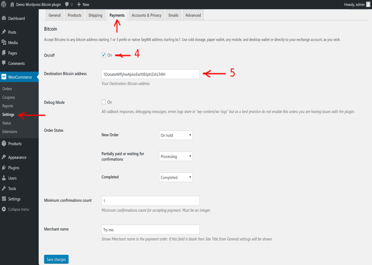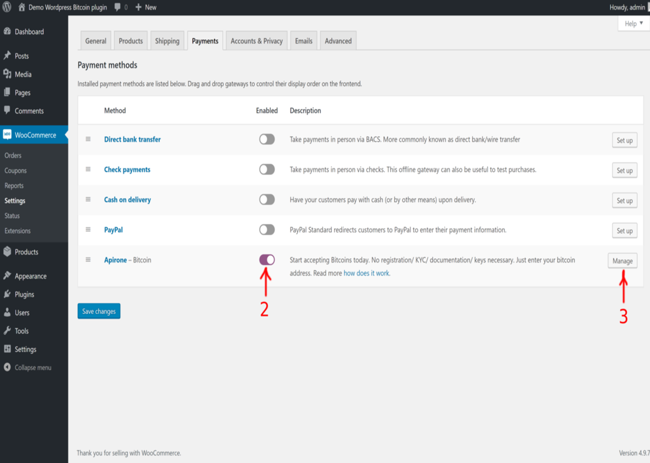 Your plugin is ready, but you have to activate it. To this end, go to the WooCommerce section and choose the “Payments“ tab page. Turn “ON“ the Apirone's checkbox (2) and click on the “Manage“ button. (3)