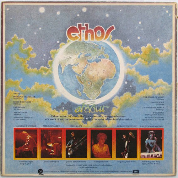"Ardor" (released in 1975) is the debut album of the American band, Ethos. The group founded in 1973 in Fort Wayne, recorded two studio albums plus a compilation called "Relics" from their Pre-Ethos stage. As for "Ardor" his debut album we find a music with insistent changes of rhythms and top quality compositional arrangements, his musical commitment is rich in sound details, along with the presence of two keyboards that cover all that simplicity and a good vocal performance . The album contains songs like "Intrepid Traveler", "Space Brothers" and "The Dimension Man" in the style of the early King Crimson works. Then we have tracks like “Long Dancer” or “E’Mocean” that are more in the vein of Genesis and Yes. Finally the most energetic and catchy song is “The Spirit Of The Music” ... Ethos is a nice band to listen to and worth knowing ...! =)