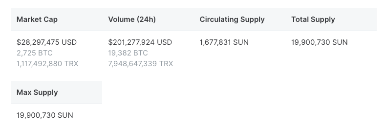 Designed as the quintessential Bitcoin equivalent on TRON, SUN features zero VC investments, zero PE investments, no pre-mining or reserve for the team, and is fully operated by the community through its open-source smart contracts.SUN is a TRC20-based crypto asset with a total supply of 1990073, which is the birthday of Justin.