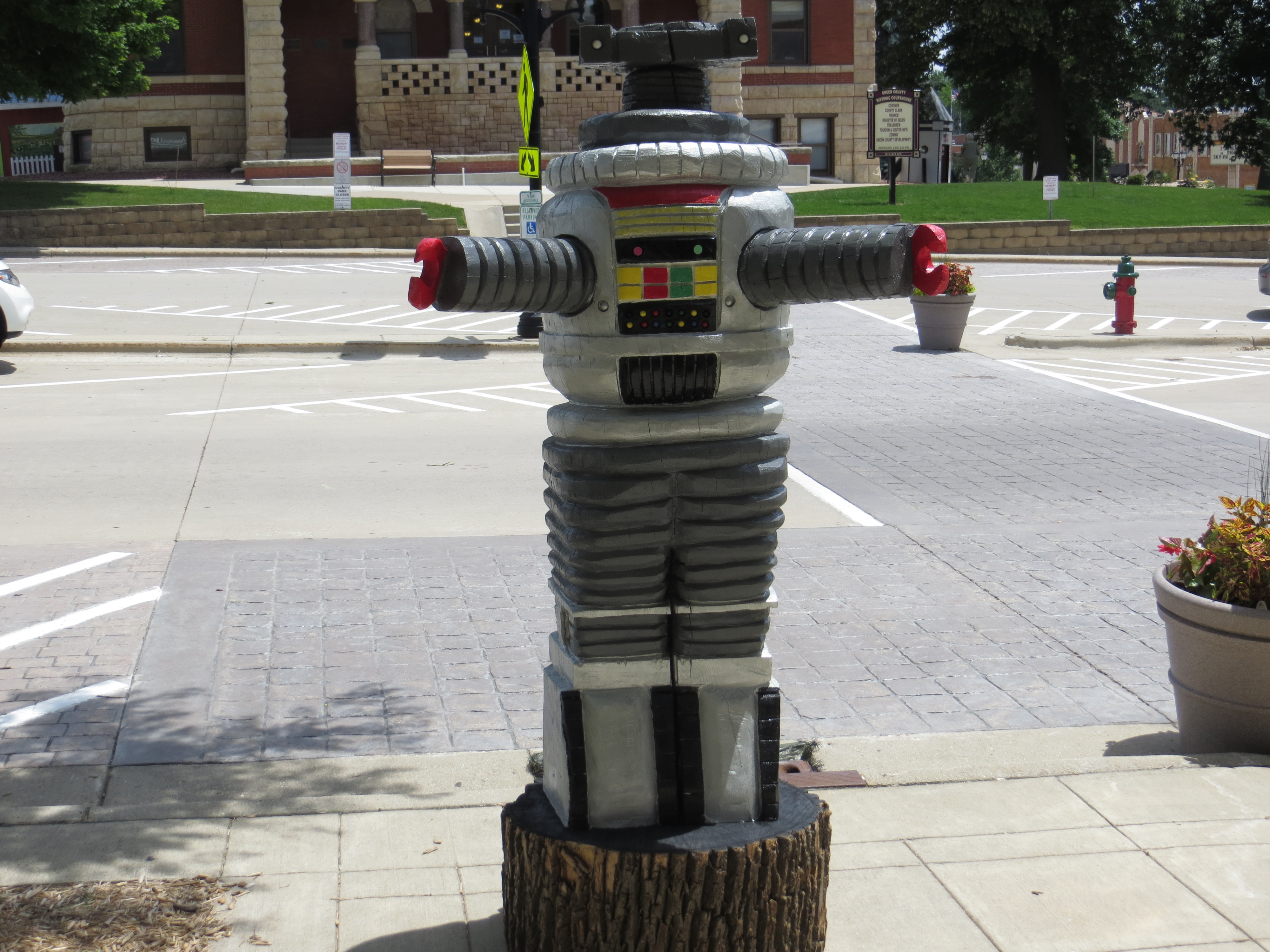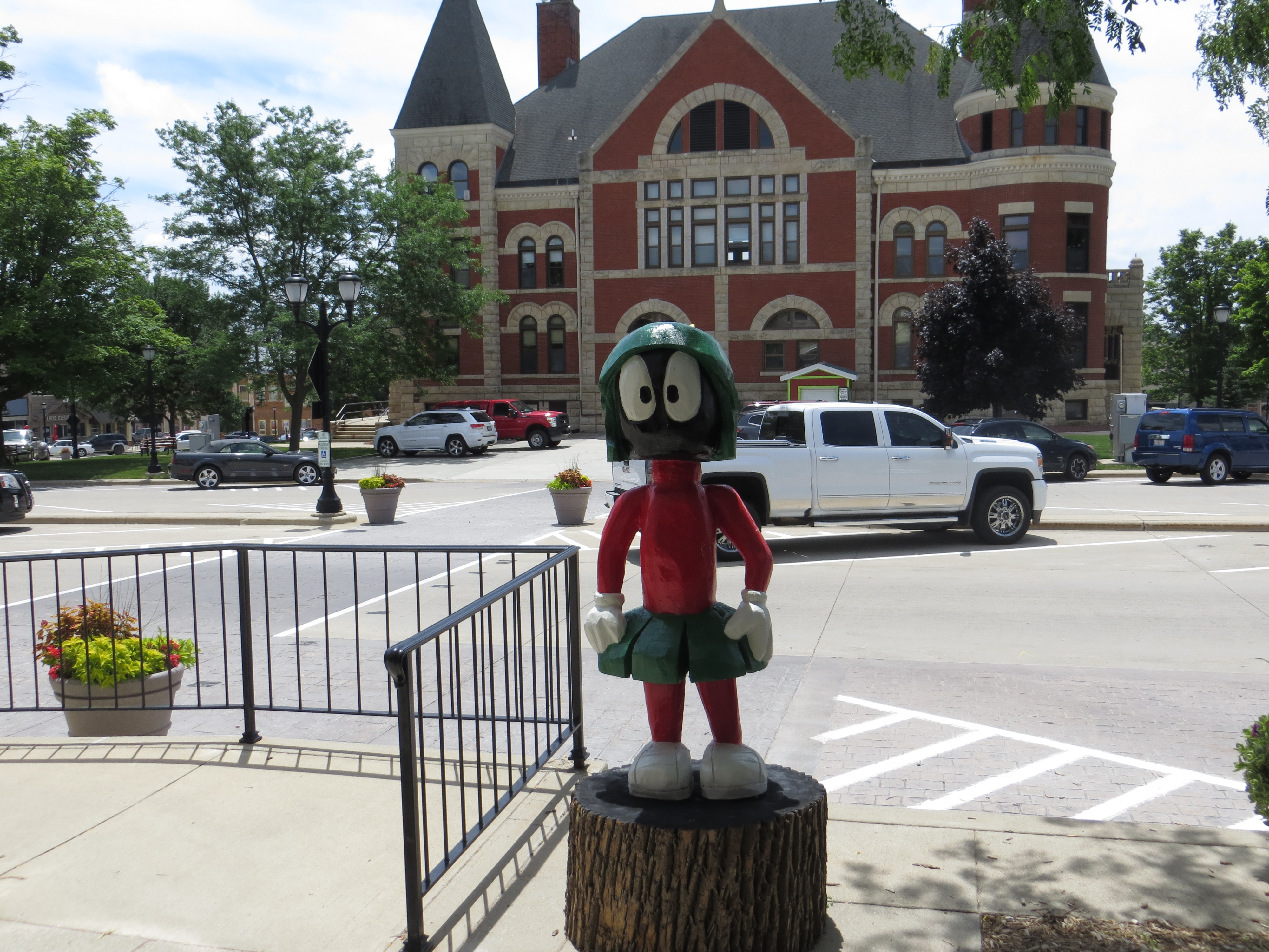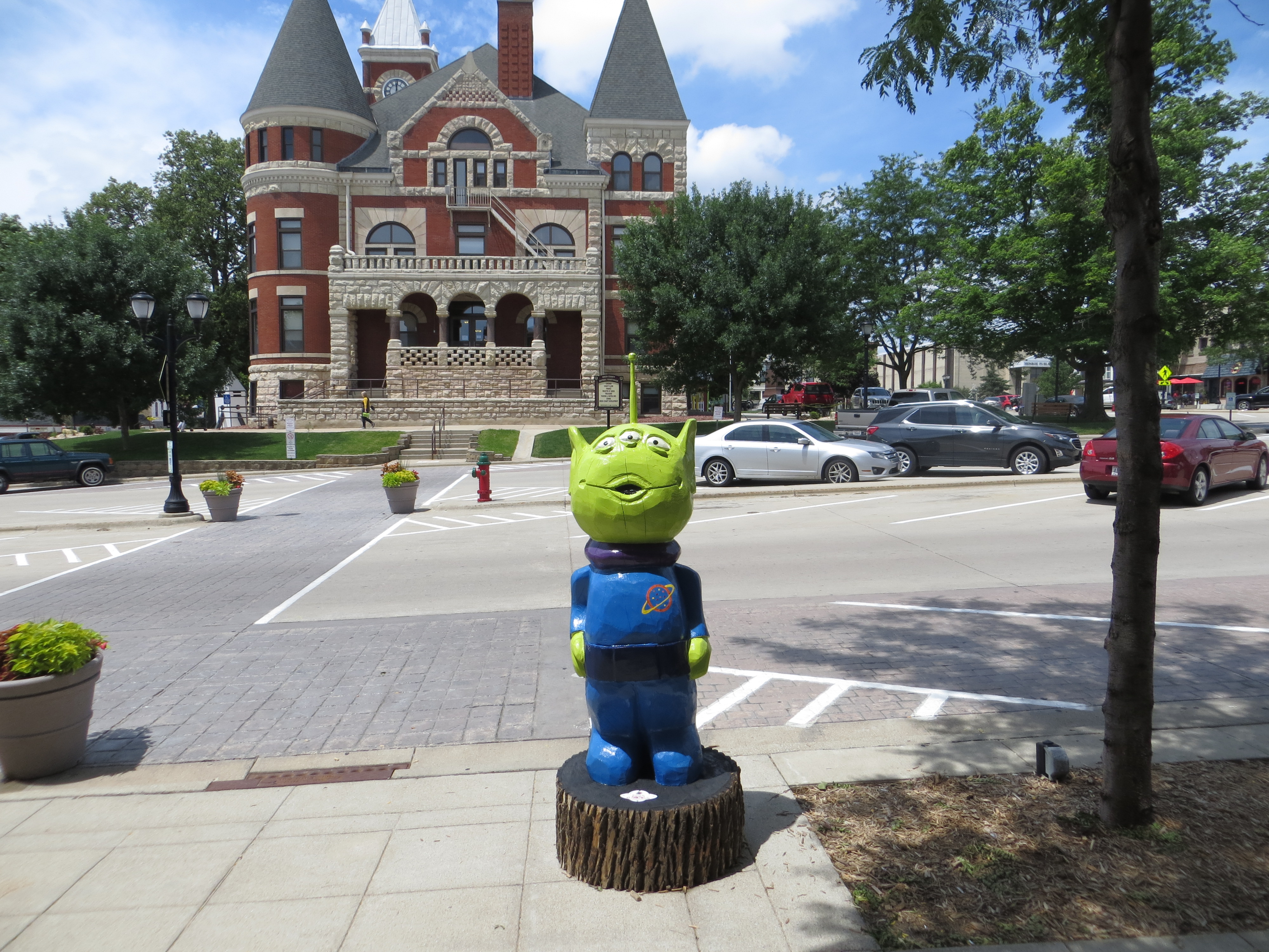 Dropped my daughter off for her week of fun and sun at summer camp and stopped for lunch in Monroe Wisconsin. Apparently the artists take over the downtown square with different themes of exhibits and such. It seems this time it's a space theme, at least I hope so. Below are some of the characters that are lining their streets which all appear to be carved of wood. To make things fun, I tagged each pic 1-7. Please feel free to comment on the name of each character. I can't give a Steem award as I have none to give so identifying each character will just give you bragging rights with your friends and family and I'll think you're pretty cool. So there's that. Have fun and enjoy downtown Monroe outer space style.