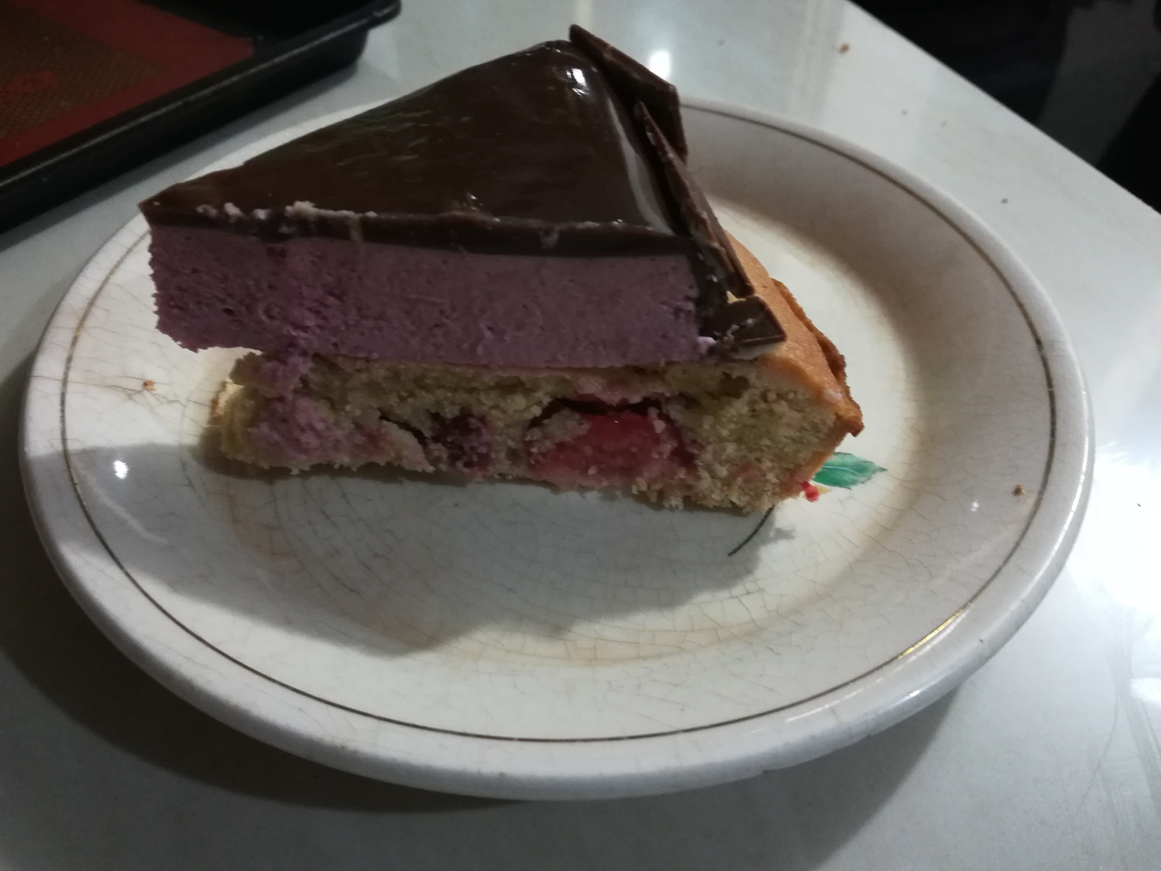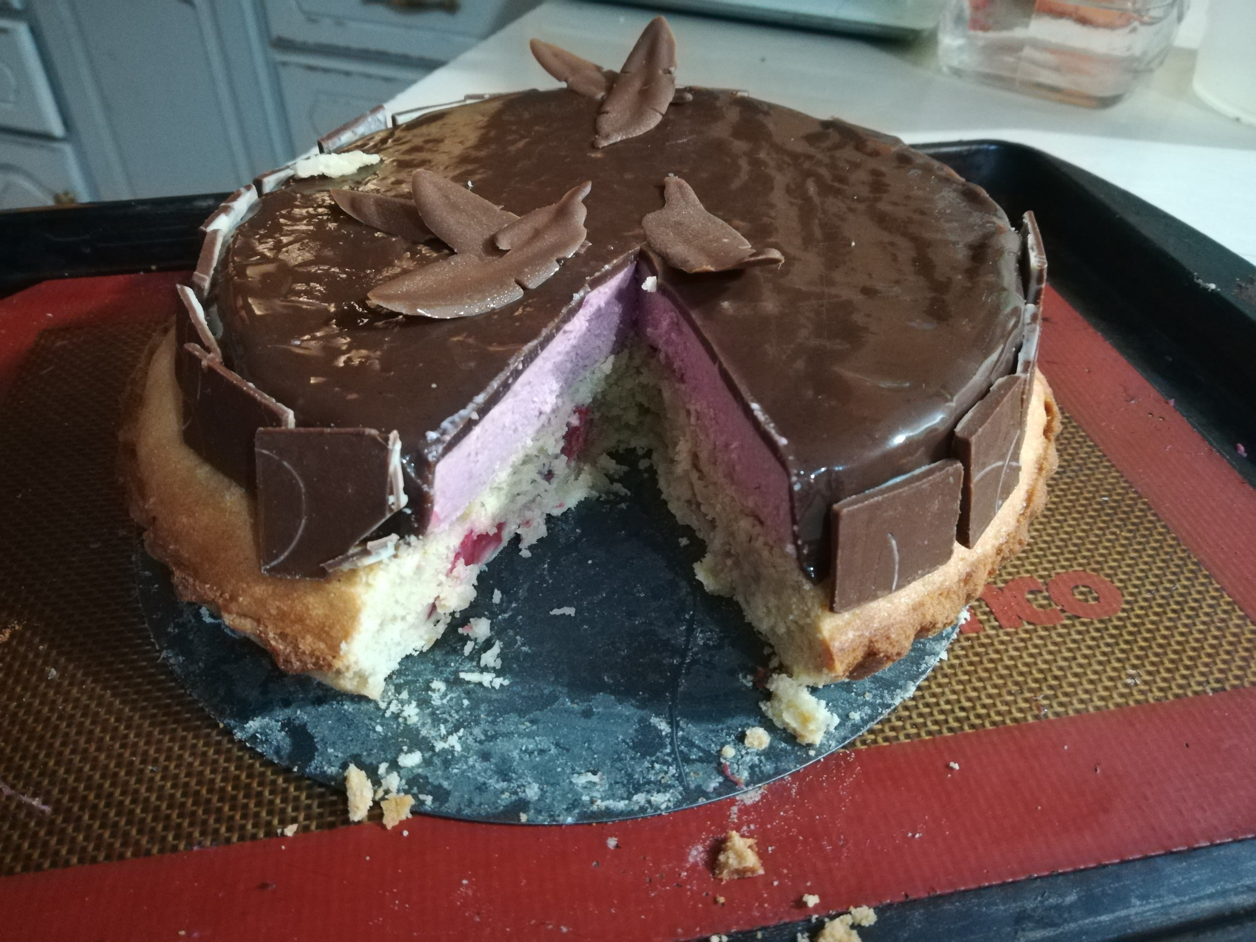 4.- Con la tarta ya un poco fría, creamos una base encima de la tarta y añadimos frambuesas y la tapamos con la crema restante.