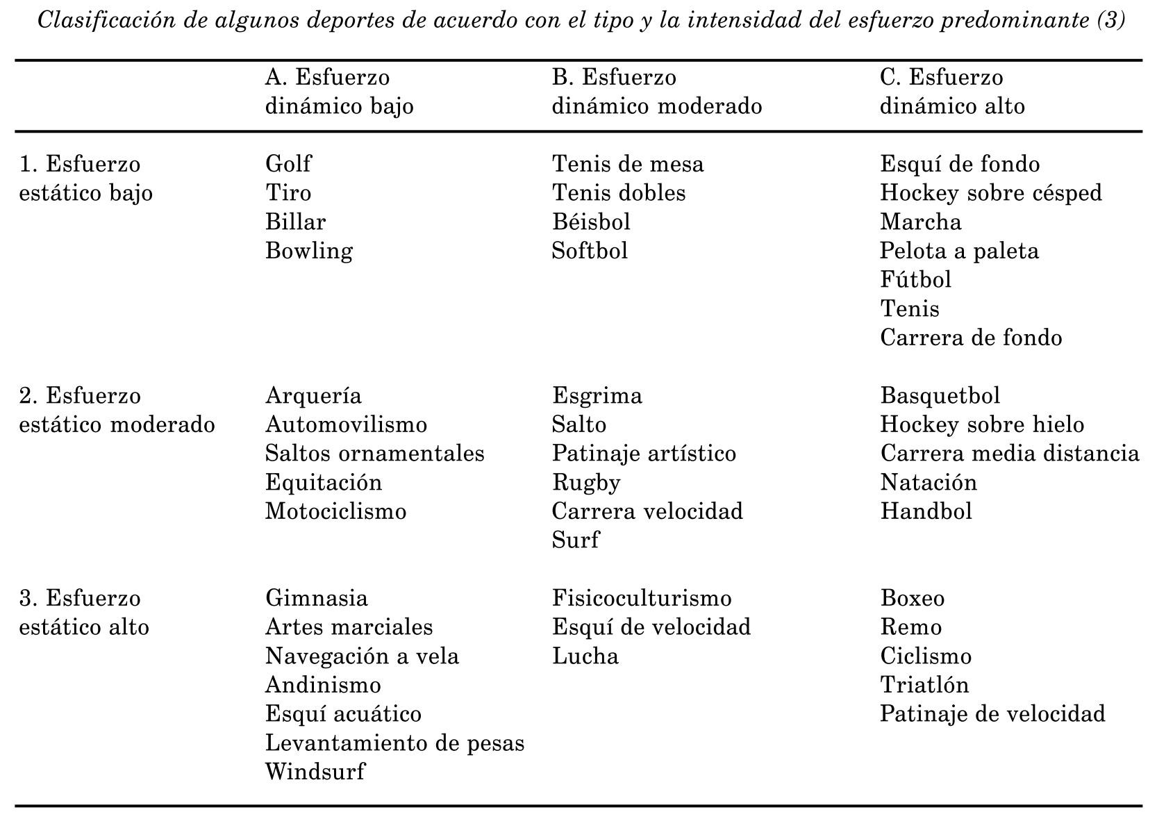 La clasificación metabólica incluye el ejercicio aeróbico, cuya energía proviene de procesos oxidativos, y el ejercicio anaeróbico, con producción energética a partir de los fosfágenos o la glucólisis anaeróbica. La obtención de energía por uno u otro metabolismo depende de la intensidad y la duración del ejercicio desarrollado. También aquí, la mayor parte de los deportes tienen formas mixtas de obtención de energía. 2