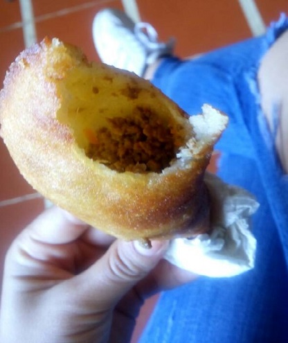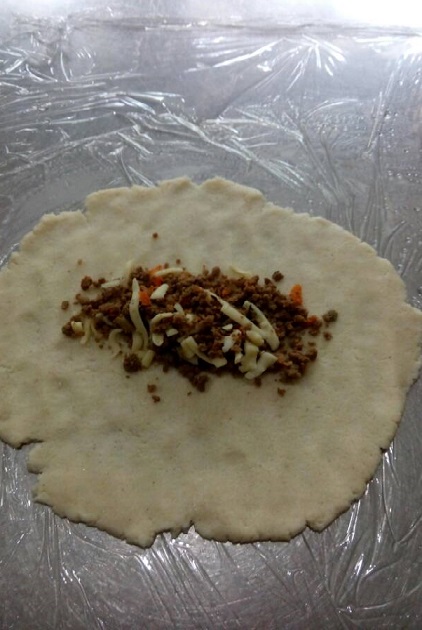 • Coloca en el centro de la masa el relleno que hayas elegido; sea carne molida, carne mechada, queso blanco o amarillo, caraotas refritas, etc.