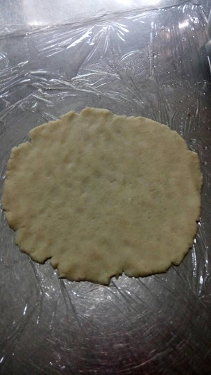 • En el papel de plástico colocas una pequeña porción de la masa, comienza a aplastar con tus dedos hasta que obtengas una rueda de aprox. 1/5 cm de grosor.
