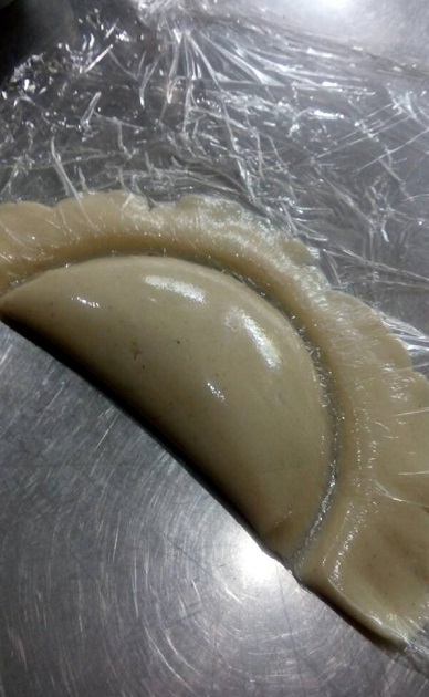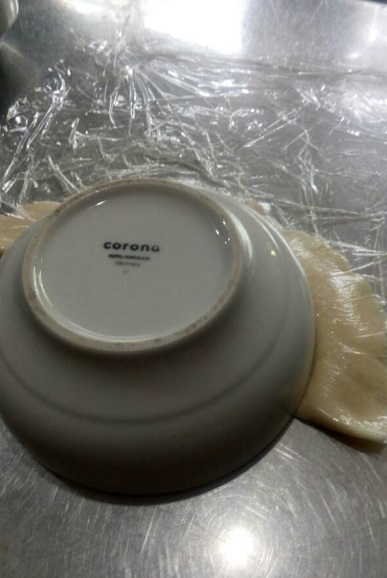 •Con la ayuda de un recipiente pequeño, incrustas la mitad del recipiente en la masa de forma de luna, eliminando el exceso de la masa restante.
