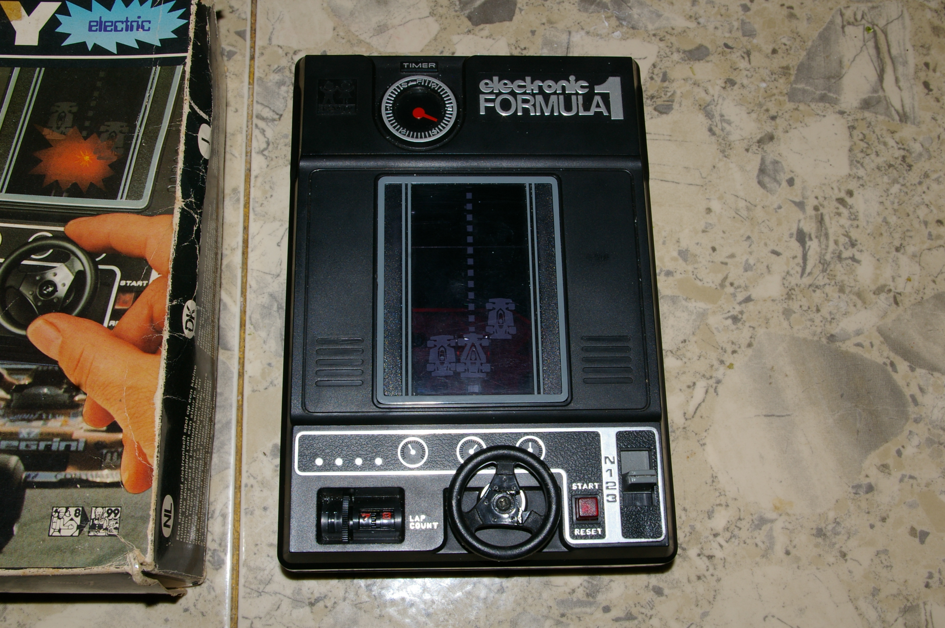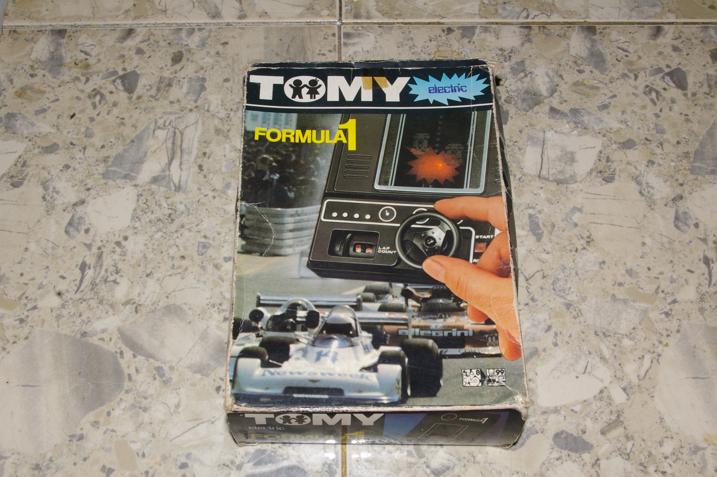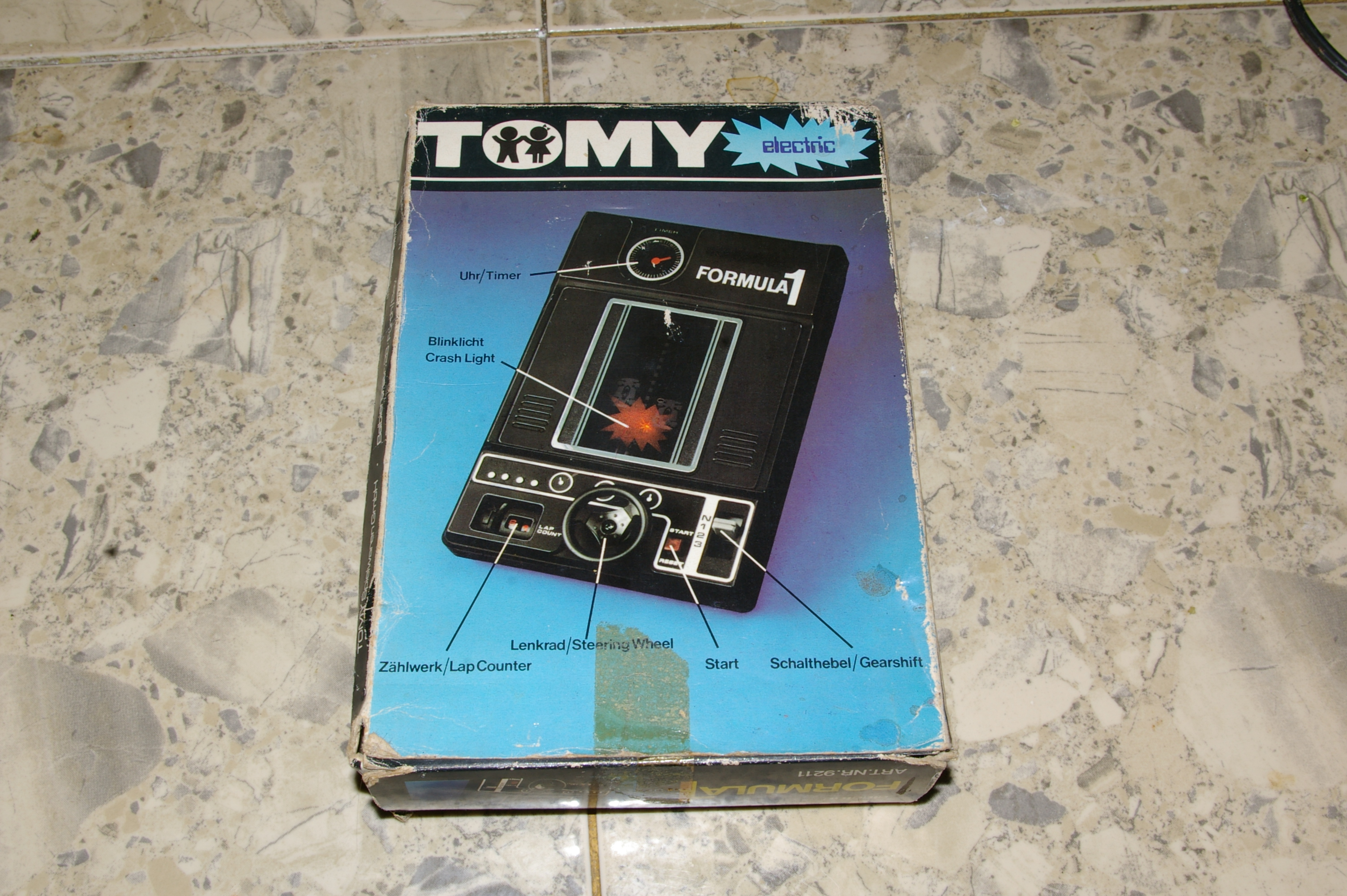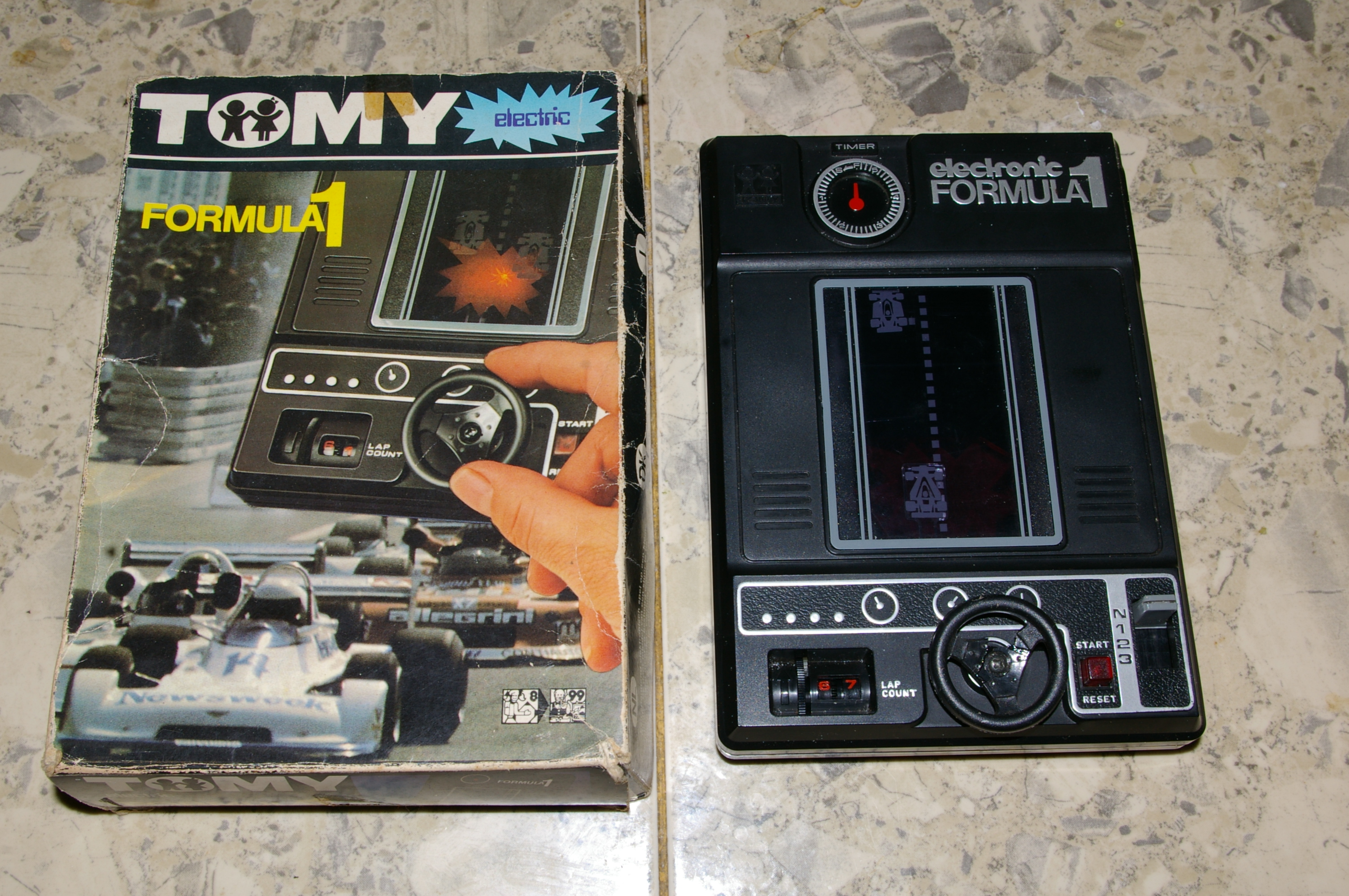 Hola a todos, hoy les quiero mostrar dos consolas portátiles que dan significado al adjetivo “retro”, ambas son fundamentalmente el mismo juego, pero realizadas en diferente forma, la primera es la Tomy Electric Formula 1, un juego de carreras de autos, fue elaborado entre 1976 y 1980 y a diferencia de todo a lo que estamos acostumbrados, no tiene, ni pantalla LCD o LED, ni conectividad Wi-fi y ni siquiera es digital, se trata de un juego eléctrico, en el que competimos con un pequeño auto, estampado en una paleta plástica, que podemos mover de un lado al otro, con un volante, a la vez que competimos con autos, también estampados, en una banda sin fin, a los que debemos evitar, mientras usamos una palanca para cambiar la velocidad a la que se desplazan, y si nos cruzamos con alguno, una luz roja y un ruido estridente nos dará aviso de que hemos chocado. Aquí pueden ver algunas fotografías.