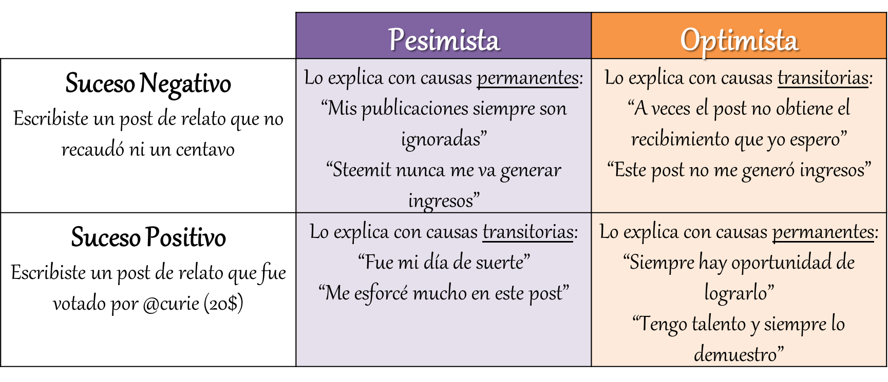 Como puedes ver, el estilo pesimista se compone de pautas permanentes para los acontecimientos negativos y pautas transitorias para los eventos positivos. En cambio, las personas de estilo optimista, le atribuyen causas transitorias a los fracasos y causas permanentes a los logros y éxitos.
