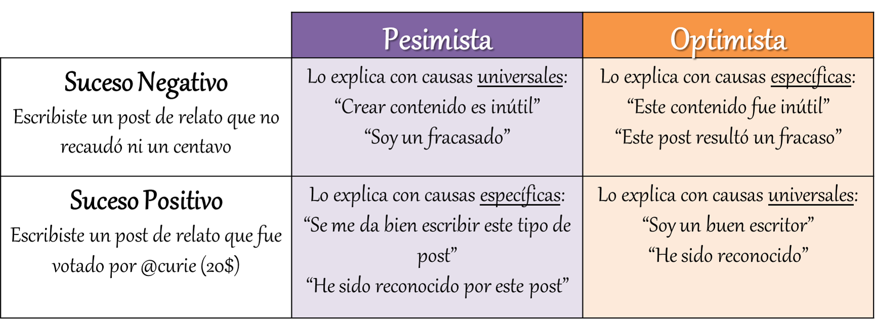 Como logras observar, el estilo pesimista se compone de pautas universales para los sucesos adversos y pautas específicas para los eventos agradables. Por el contrario, las personas de estilo optimista, le atribuyen causas específicas a los fracasos y causas universales a los triunfos.