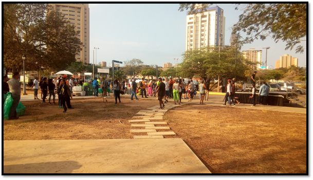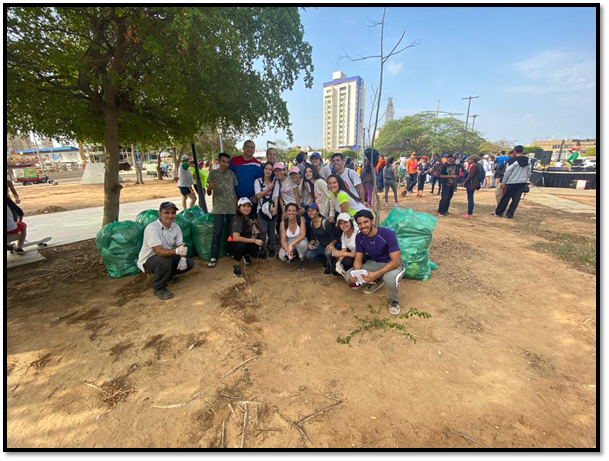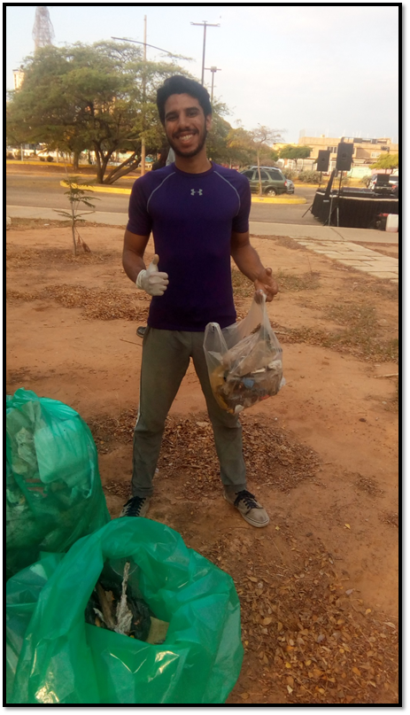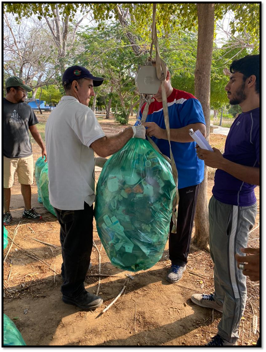 De igual forma las personas que generalmente practican ejercicio trotando en esta avenida se sumaron a la actividad, usando una bolsa y guantes recogieron los residuos que se conseguían por el camino, así mismo cuando la bolsa estaba llena era vaciada en unos “carritos” y se repetía el proceso hasta llegar al parque La Marina, en el cual me encontraba yo limpiando junto a otros organizadores realizando una limpieza del parque, preparando todo para pesaje y cuantificación de los residuos.